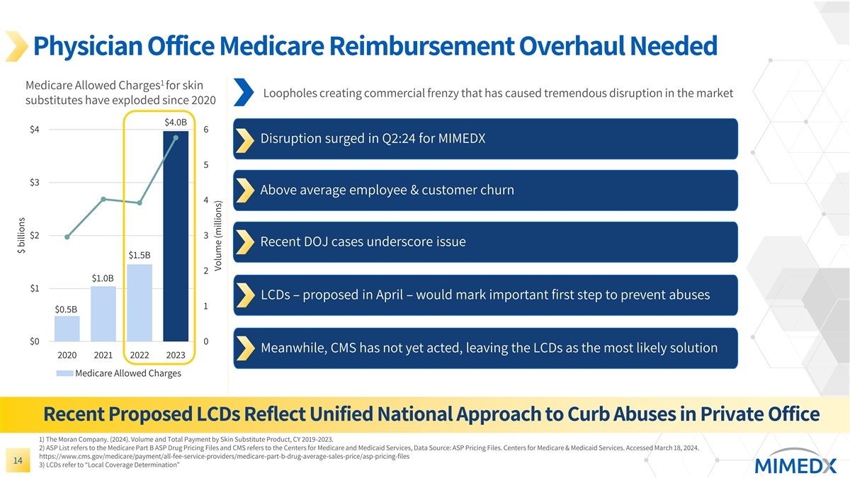 Physician Office Medicare Reimbursement Overhaul Needed 1 Medicare Allowed Charges for skin Loopholes creating commercial frenzy that has caused tremendous disruption in the market substitutes have exploded since 2020 $4.0B $4 6 Disruption surged in Q2:24 for MIMEDX 5 $3 Above average employee & customer churn 4 $2 3 Recent DOJ cases underscore issue $1.5B 2 $1.0B $1 LCDs – proposed in April – would mark important first step to prevent abuses 1 $0.5B $0 0 Meanwhile, CMS has not yet acted, leaving the LCDs as the most likely solution 2020 2021 2022 2023 Medicare Allowed Charges Recent Proposed LCDs Reflect Unified National Approach to Curb Abuses in Private Office 1) The Moran Company. (2024). Volume and Total Payment by Skin Substitute Product, CY 2019-2023. 2) ASP List refers to the Medicare Part B ASP Drug Pricing Files and CMS refers to the Centers for Medicare and Medicaid Services, Data Source: ASP Pricing Files. Centers for Medicare & Medicaid Services. Accessed March 18, 2024. https://www.cms.gov/medicare/payment/all-fee-service-providers/medicare-part-b-drug-average-sales-price/asp-pricing-files 14 3) LCDs refer to “Local Coverage Determination” $ billions Volume (millions)