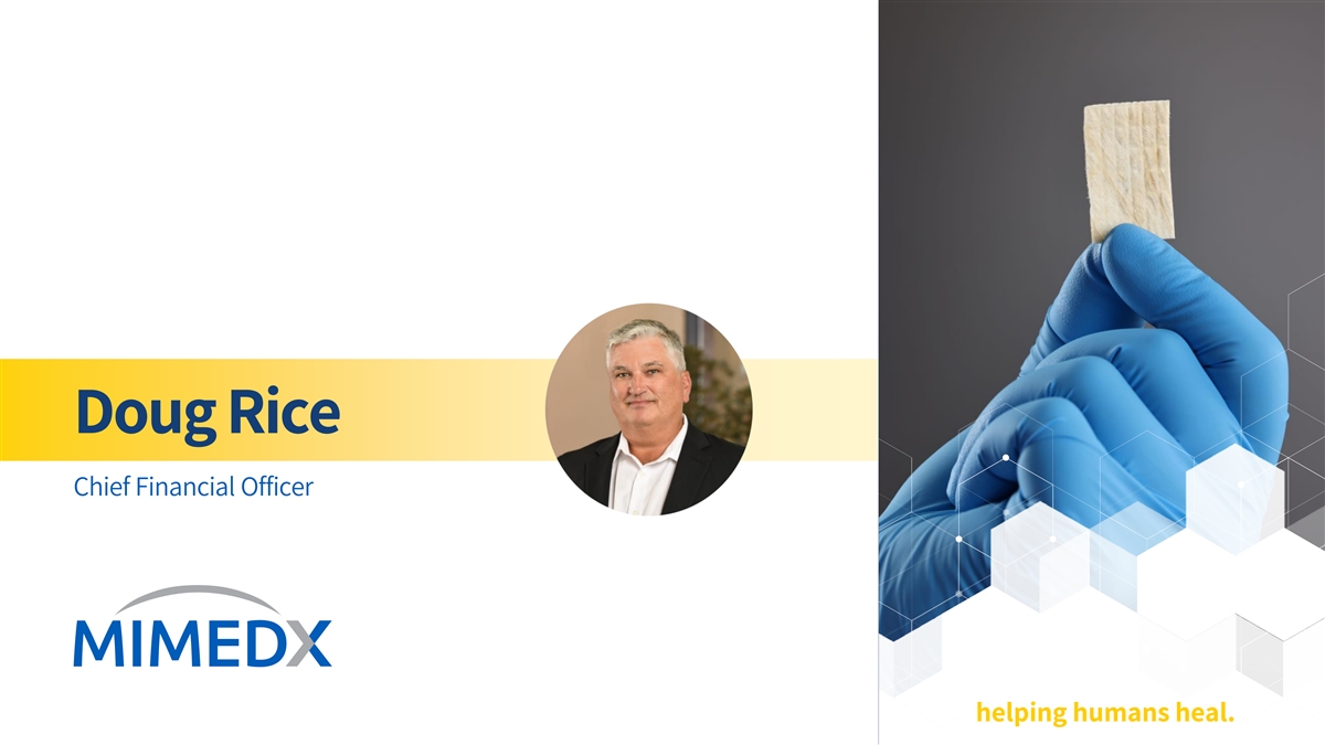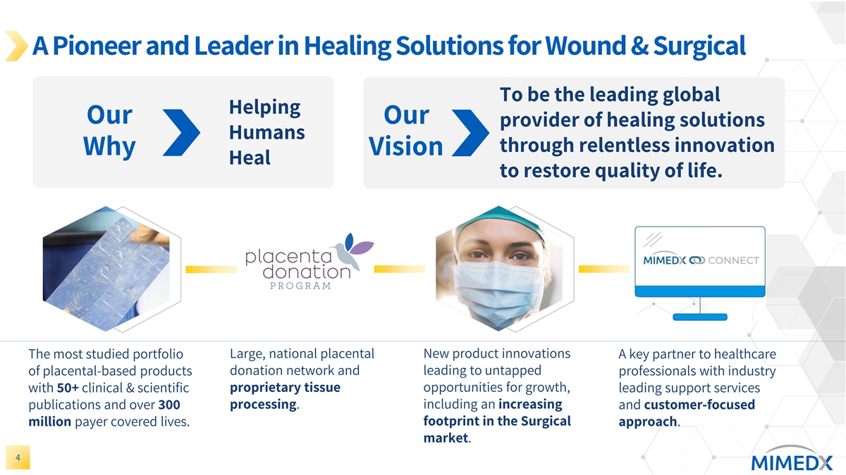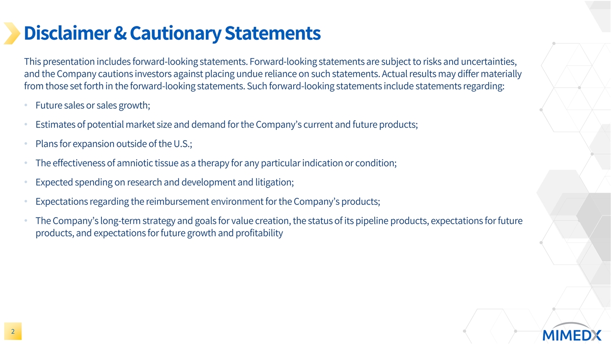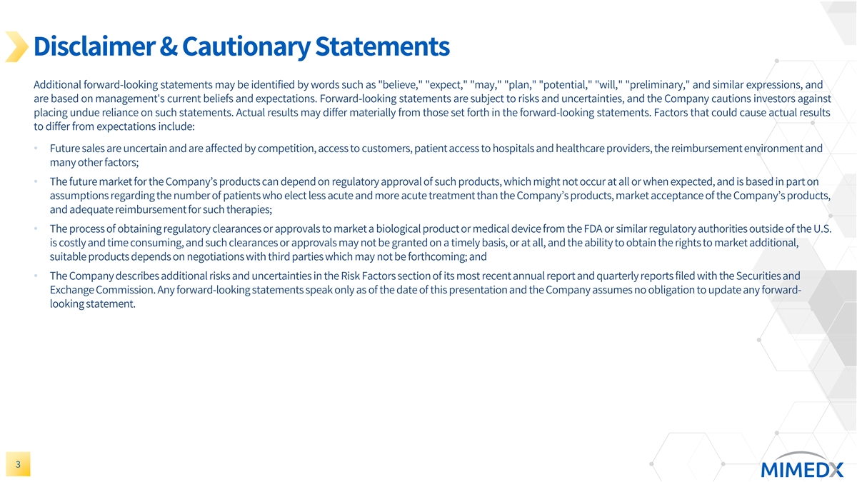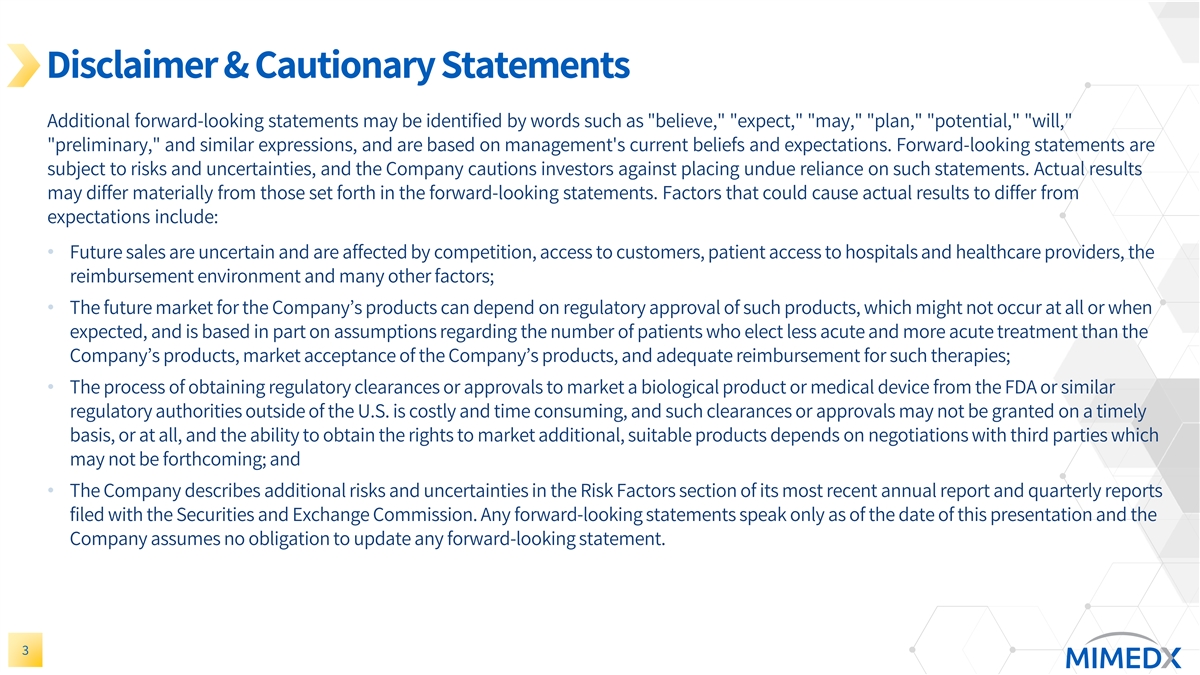 Disclaimer & Cautionary Statements This presentation includes forward-looking statements. Forward-looking statements are subject to risks and uncertainties, and the Company cautions investors against placing undue reliance on such statements. Actual results may differ materially from those set forth in the forward-looking statements. Such forward-looking statements include statements regarding: • Future sales or sales growth; • Estimates of potential market size and demand for the Company’s current and future products; • Plans for expansion outside of the U.S.; • The effectiveness of amniotic tissue as a therapy for any particular indication or condition; • Expected spending on research and development and litigation; • Expectations regarding the reimbursement environment for the Company’s products; • The Company’s long-term strategy and goals for value creation, the status of its pipeline products, expectations for future products, and expectations for future growth and profitability 2