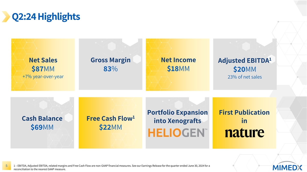 This report includes forward-looking statements. Statements regarding: (i) future sales or sales growth; (ii) our 2024 financial goals and expectations for future financial results, including levels of net sales, Adjusted EBITDA, Adjusted EBITDA margin, corporate expenses and cash; (iii) our cash flows; (iv) our expectations regarding our new products, including EPIEFFECT and AMNIOEFFECT; (v) our expectations regarding the launch of our collagen particulate xenograft product; and (vi) continued growth in different care settings. Additional forward-looking statements may be identified by words such as “believe,” “expect,” “may,” “plan,” “goal,” “outlook,” “potential,” “will,” “preliminary,” and similar expressions, and are based on management’s current beliefs and expectations.
