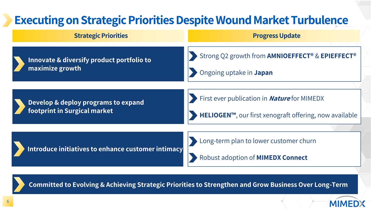 Executing on Strategic Priorities Despite Wound Market Turbulence Strategic Priorities Progress Update ➢ Strong Q2 growth from AMNIOEFFECT® & EPIEFFECT® Innovate & diversify product portfolio to maximize growth ➢ Ongoing uptake in Japan ➢ First ever publication in Nature for MIMEDX Develop & deploy programs to expand footprint in Surgical market ➢ HELIOGEN , our first xenograft offering, now available ➢ Long-term plan to lower customer churn Introduce initiatives to enhance customer intimacy ➢ Robust adoption of MIMEDX Connect Committed to Evolving & Achieving Strategic Priorities to Strengthen and Grow Business Over Long-Term 6