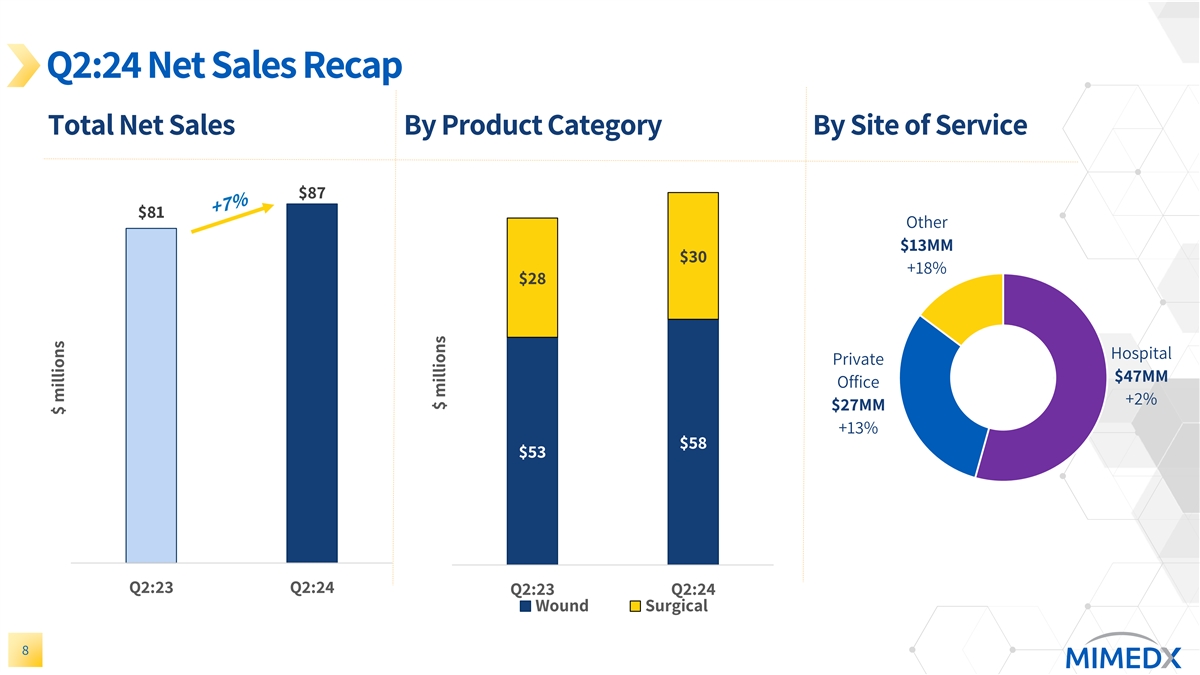 Q2:24 Net Sales Recap Total Net Sales By Product Category By Site of Service $87 $81 Other $13MM $30 +18% $28 Hospital Private $47MM Office +2% $27MM +13% $58 $53 Q2:23 Q2:24 Q2:23 Q2:24 Wound Surgical 8 $ millions $ millions