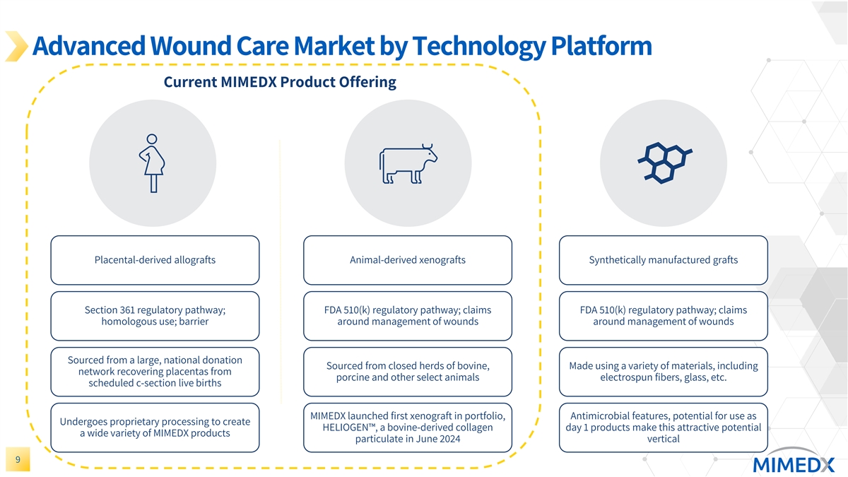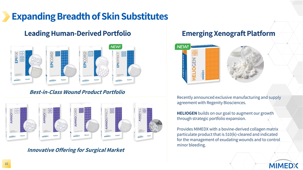 Advanced Wound Care Market by Technology Platform Current MIMEDX Product Offering Placental-derived allografts Animal-derived xenografts Synthetically manufactured grafts Section 361 regulatory pathway; FDA 510(k) regulatory pathway; claims FDA 510(k) regulatory pathway; claims homologous use; barrier around management of wounds around management of wounds Sourced from a large, national donation Sourced from closed herds of bovine, Made using a variety of materials, including network recovering placentas from porcine and other select animals electrospun fibers, glass, etc. scheduled c-section live births MIMEDX launched first xenograft in portfolio, Antimicrobial features, potential for use as Undergoes proprietary processing to create HELIOGEN , a bovine-derived collagen day 1 products make this attractive potential a wide variety of MIMEDX products particulate in June 2024 vertical 9
