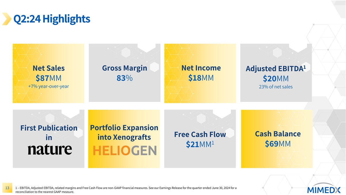 Q2:24 Highlights 1 Net Income Net Sales Gross Margin Adjusted EBITDA $18MM $87MM 83% $20MM +7% year-over-year 23% of net sales Portfolio Expansion First Publication Cash Balance Free Cash Flow into Xenografts in 1 $69MM $21MM 13 1 – EBITDA, Adjusted EBITDA, related margins and Free Cash Flow are non-GAAP financial measures. See our Earnings Release for the quarter ended June 30, 2024 for a reconciliation to the nearest GAAP measure.