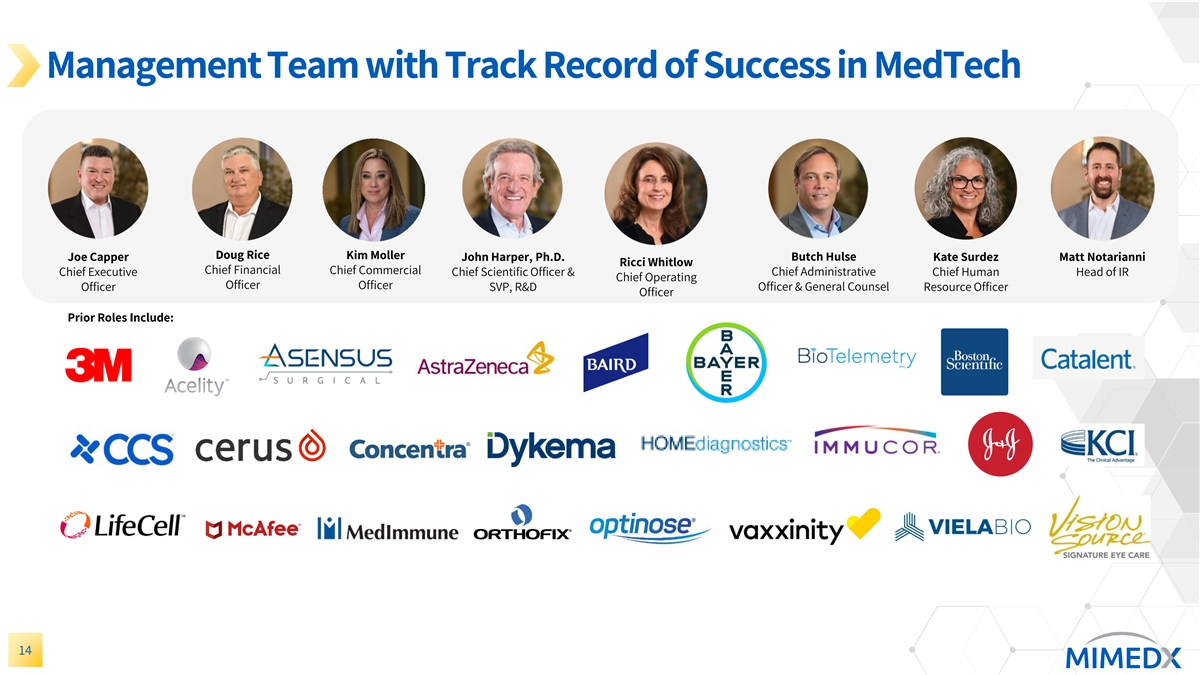 Q2:24 Summary Net Sales of $87 million were up 7% year-over-year Gross profit margin 83% Adjusted EBITDA of $20 million reflected 23% of net sales Q2:24 cash balance of $69 million HELIOGEN launch underway and already being used in surgical cases Recent Nature publication builds on our industry-leading scientific evidence base and expands use cases for amniotic tissue 13