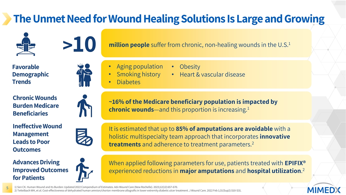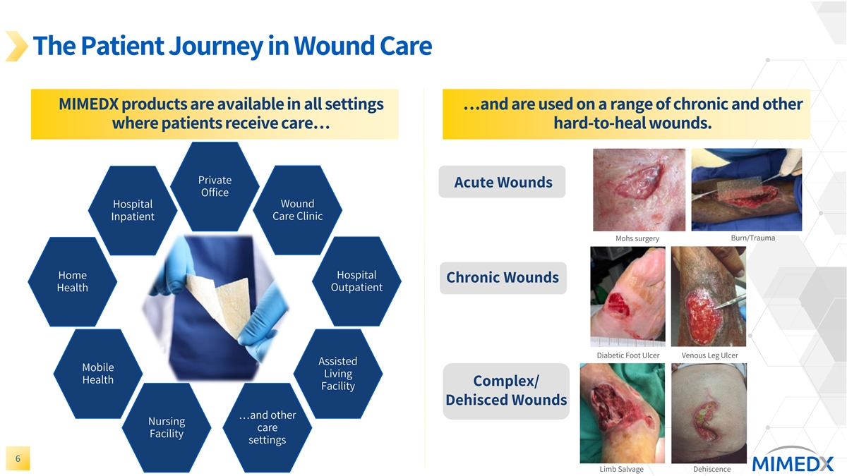 The Unmet Need for Wound Healing Solutions Is Large and Growing 1 million people suffer from chronic, non-healing wounds in the U.S. >10 • Aging population Favorable • Obesity Demographic • Smoking history• Heart & vascular disease Trends • Diabetes Chronic Wounds ~16% of the Medicare beneficiary population is impacted by Burden Medicare 1 chronic wounds—and this proportion is increasing. Beneficiaries Ineffective Wound It is estimated that up to 85% of amputations are avoidable with a Management holistic multispecialty team approach that incorporates innovative Leads to Poor 2 treatments and adherence to treatment parameters. Outcomes Advances Driving When applied following parameters for use, patients treated with EPIFIX® 2 Improved Outcomes experienced reductions in major amputations and hospital utilization. for Patients 1) Sen CK. Human Wound and Its Burden: Updated 2022 Compendium of Estimates. Adv Wound Care (New Rochelle). 2023;12(12):657-670. 5 2) Tettelbach WH, et al. Cost-effectiveness of dehydrated human amnion/chorion membrane allografts in lower extremity diabetic ulcer treatment. J Wound Care. 2022 Feb 1;31(Sup2):S10-S31.