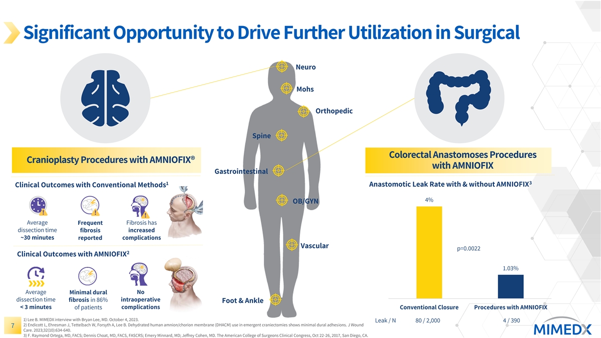 Significant Opportunity to Drive Further Utilization in Surgical Neuro Mohs Orthopedic Spine Colorectal Anastomoses Procedures Cranioplasty Procedures with AMNIOFIX® with AMNIOFIX Gastrointestinal 3 1 Anastomotic Leak Rate with & without AMNIOFIX Clinical Outcomes with Conventional Methods 4% OB/GYN Average Frequent Fibrosis has dissection time fibrosis increased ~30 minutes reported complications Vascular p=0.0022 2 Clinical Outcomes with AMNIOFIX 1.03% Average Minimal dural No dissection time fibrosis in 86% intraoperative Foot & Ankle < 3 minutes of patients complications Conventional Closure Procedures with AMNIOFIX 1) Lee B. MIMEDX interview with Bryan Lee, MD. October 4, 2023. Leak / N 80 / 2,000 4 / 390 2) Endicott L, Ehresman J, Tettelbach W, Forsyth A, Lee B. Dehydrated human amnion/chorion membrane (DHACM) use in emergent craniectomies shows minimal dural adhesions. J Wound 7 Care. 2023;32(10):634-640. 3) F. Raymond Ortega, MD, FACS; Dennis Choat, MD, FACS, FASCRS; Emery Minnard, MD; Jeffrey Cohen, MD. The American College of Surgeons Clinical Congress, Oct 22-26, 2017, San Diego, CA.