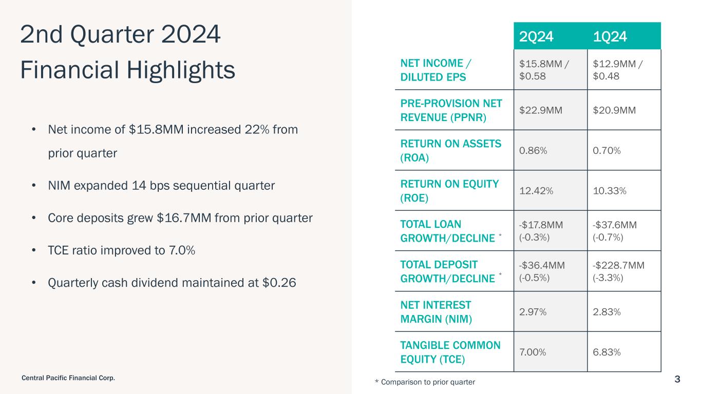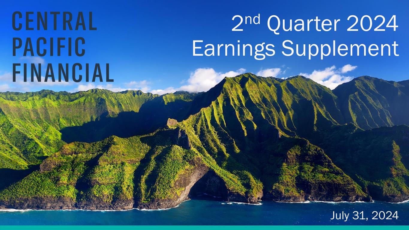 HONOLULU, HI, July 31, 2024 – Central Pacific Financial Corp. (NYSE: CPF) (the "Company"), parent company of Central Pacific Bank (the "Bank" or "CPB"), today reported net income of $15.8 million, or fully diluted earnings per share ("EPS") of $0.58 for the second quarter of 2024, compared to net income of $12.9 million, or EPS of $0.48 in the previous quarter and net income of $14.5 million, or EPS of $0.53 in the year-ago quarter.