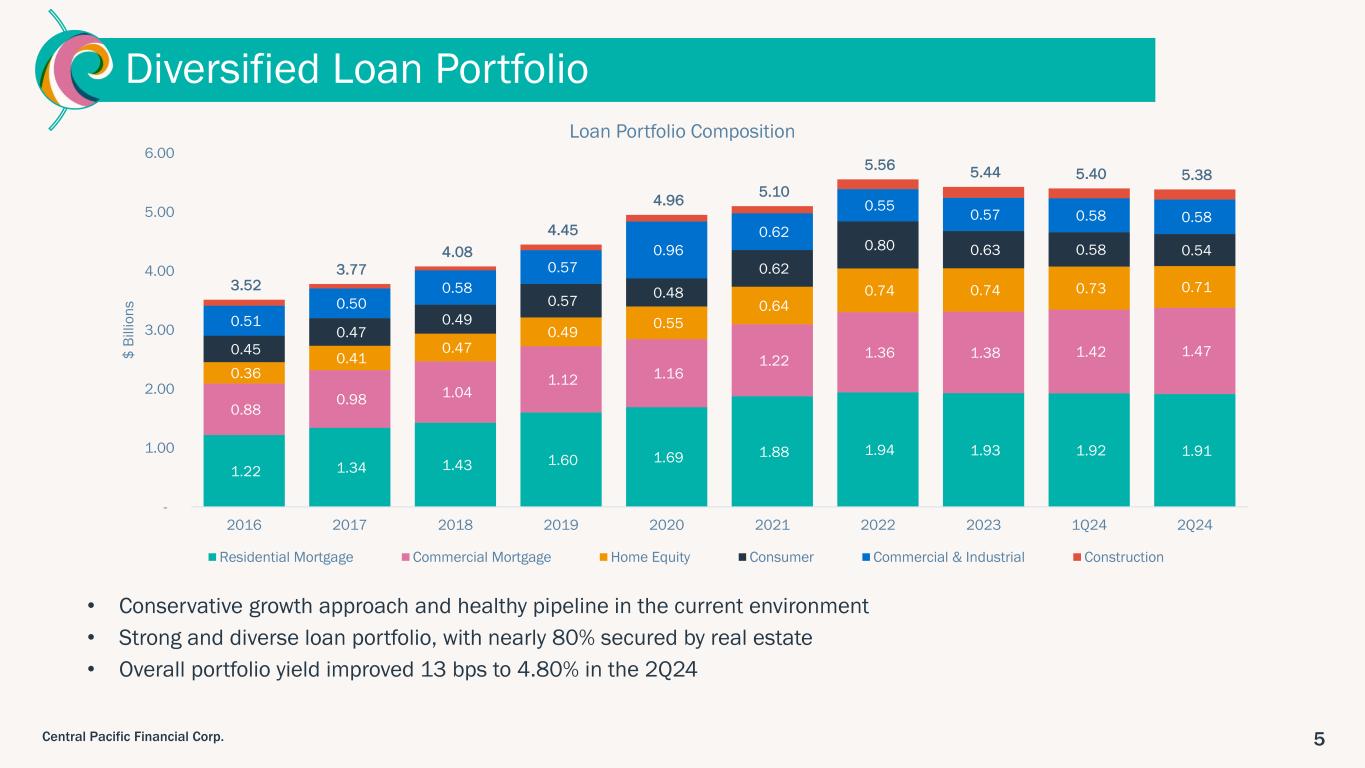 4Central Pacific Financial Corp. Tourism Visitor arrivals compared to pre-pandemic 92% 1 Employment Unemployment Rate June 2024 2.9% 1 FACTORS FOR A FAVORABLE HAWAII OUTLOOK • Maui tourism recovery from Maui wildfires in August 2023 continues with visitor arrivals at 78% of the previous year in June 2024 • Japanese visitor return slowly improving, with counts up 28% from a year ago, yet still at ~50% of pre-pandemic levels • Low unemployment and strong real estate market • Substantial Federal government contracts and military investments • Increase in public and private investments to address housing shortage 1 Source: Hawaii Department of Business, Economic Development & Tourism. Tourism represents total visitor in June 2024 compared to June 2019. 2 Source: Honolulu Board of Realtors. Resilient Hawaii Economy Housing Oahu Median Single- Family Home Price June 2024 $1.1MM 2 1