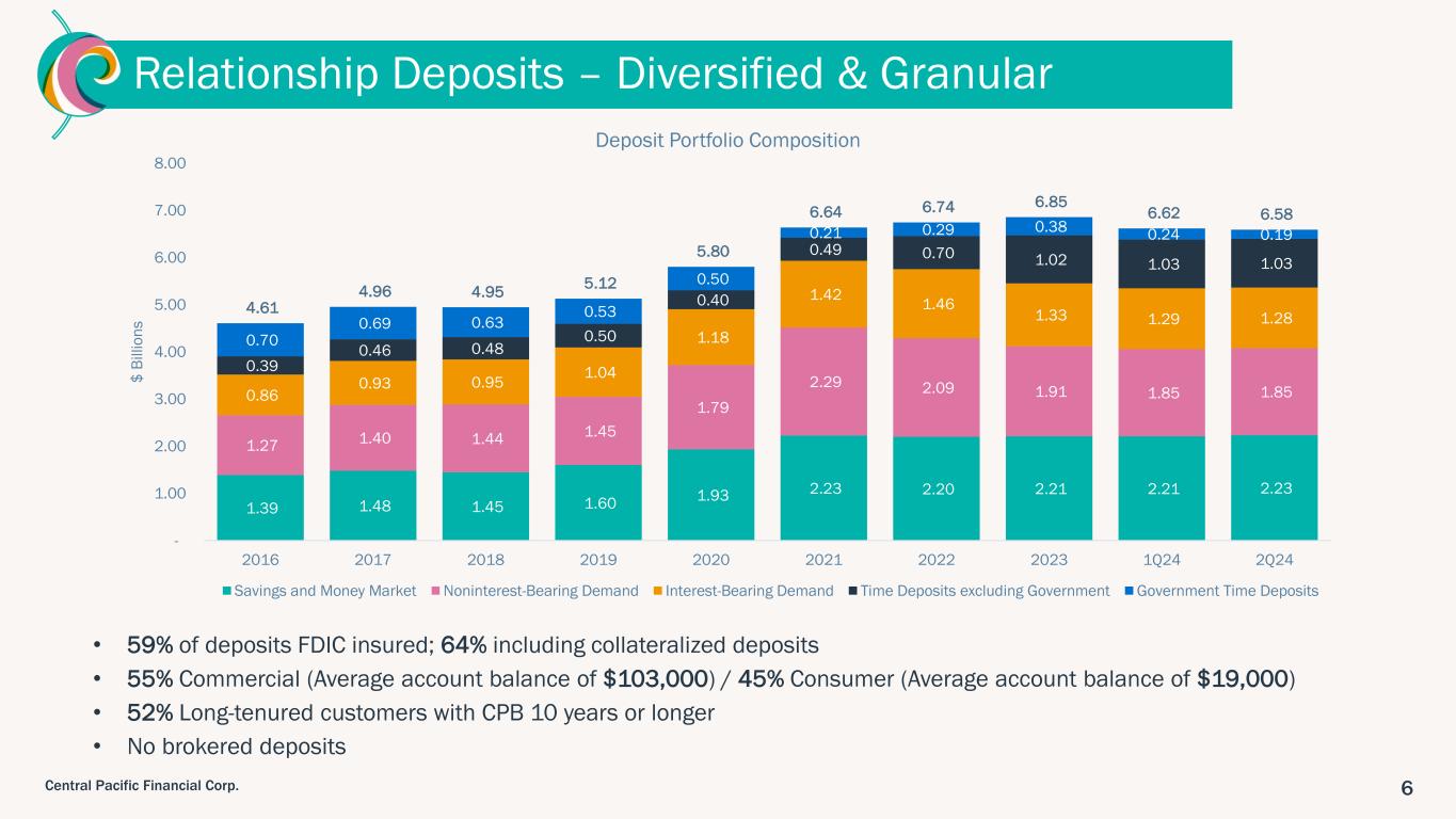 5Central Pacific Financial Corp. • Conservative growth approach and healthy pipeline in the current environment • Strong and diverse loan portfolio, with nearly 80% secured by real estate • Overall portfolio yield improved 13 bps to 4.80% in the 2Q24 Diversified Loan Portfolio2 1.22 1.34 1.43 1.60 1.69 1.88 1.94 1.93 1.92 1.91 0.88 0.98 1.04 1.12 1.16 1.22 1.36 1.38 1.42 1.47 0.36 0.41 0.47 0.49 0.55 0.64 0.74 0.74 0.73 0.71 0.45 0.47 0.49 0.57 0.48 0.62 0.80 0.63 0.58 0.54 0.51 0.50 0.58 0.57 0.96 0.62 0.55 0.57 0.58 0.58 3.52 3.77 4.08 4.45 4.96 5.10 5.56 5.44 5.40 5.38 - 1.00 2.00 3.00 4.00 5.00 6.00 2016 2017 2018 2019 2020 2021 2022 2023 1Q24 2Q24 $ B il li o n s Loan Portfolio Composition Residential Mortgage Commercial Mortgage Home Equity Consumer Commercial & Industrial Construction