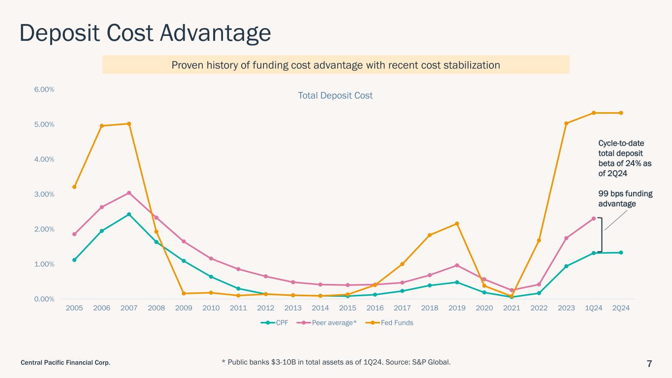6Central Pacific Financial Corp. Relationship Deposits – Diversified & Granular • 59% of deposits FDIC insured; 64% including collateralized deposits • 55% Commercial (Average account balance of $103,000) / 45% Consumer (Average account balance of $19,000) • 52% Long-tenured customers with CPB 10 years or longer • No brokered deposits 1.39 1.48 1.45 1.60 1.93 2.23 2.20 2.21 2.21 2.23 1.27 1.40 1.44 1.45 1.79 2.29 2.09 1.91 1.85 1.85 0.86 0.93 0.95 1.04 1.18 1.42 1.46 1.33 1.29 1.28 0.39 0.46 0.48 0.50 0.40 0.49 0.70 1.02 1.03 1.03 0.70 0.69 0.63 0.53 0.50 0.21 0.29 0.38 0.24 0.19 4.61 4.96 4.95 5.12 5.80 6.64 6.74 6.85 6.62 6.58 - 1.00 2.00 3.00 4.00 5.00 6.00 7.00 8.00 2016 2017 2018 2019 2020 2021 2022 2023 1Q24 2Q24 $ B il li o n s Deposit Portfolio Composition Savings and Money Market Noninterest-Bearing Demand Interest-Bearing Demand Time Deposits excluding Government Government Time Deposits