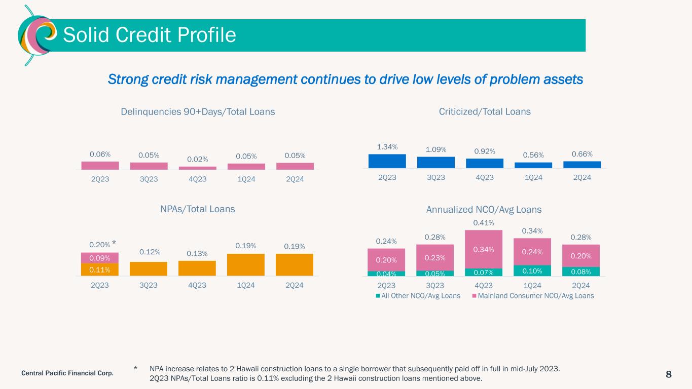 7Central Pacific Financial Corp. 0.00% 1.00% 2.00% 3.00% 4.00% 5.00% 6.00% 2005 2006 2007 2008 2009 2010 2011 2012 2013 2014 2015 2016 2017 2018 2019 2020 2021 2022 2023 1Q24 2Q24 Total Deposit Cost CPF Peer average* Fed Funds Deposit Cost Advantage * Public banks $3-10B in total assets as of 1Q24. Source: S&P Global. Cycle-to-date total deposit beta of 24% as of 2Q24 99 bps funding advantage Proven history of funding cost advantage with recent cost stabilization
