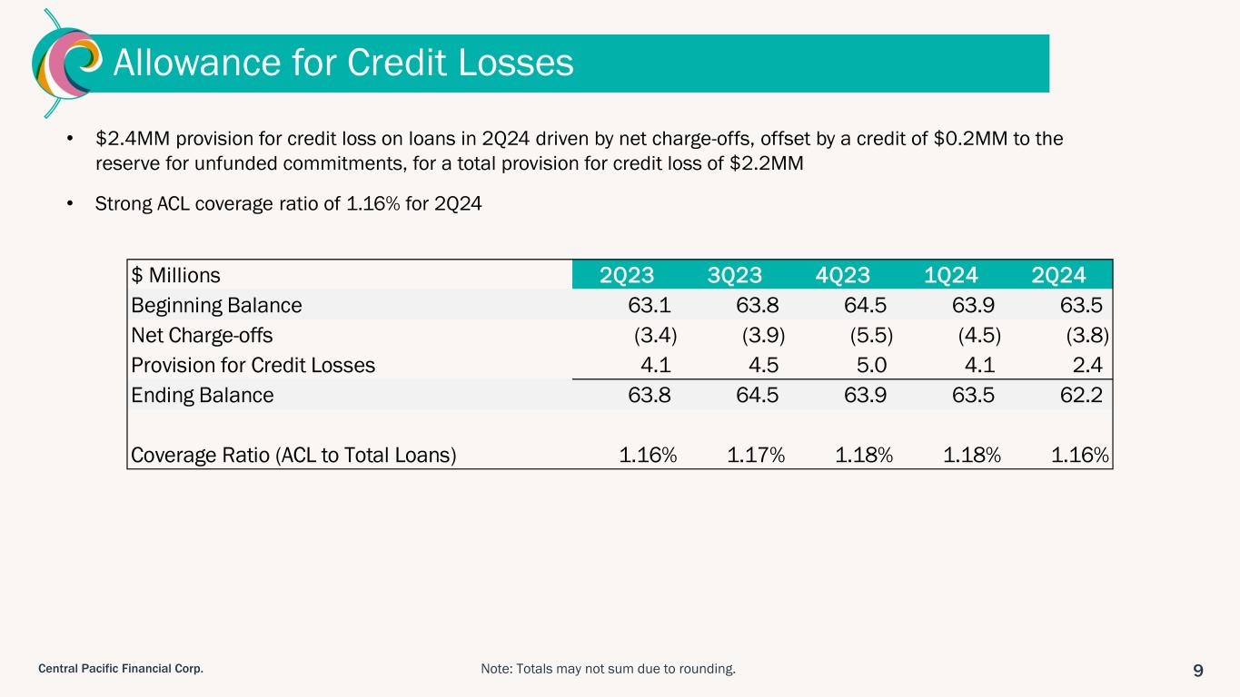 8Central Pacific Financial Corp. 0.11% 0.12% 0.13% 0.19% 0.19% 0.09% 0.20% 2Q23 3Q23 4Q23 1Q24 2Q24 NPAs/Total Loans 5 * NPA increase relates to 2 Hawaii construction loans to a single borrower that subsequently paid off in full in mid-July 2023. 2Q23 NPAs/Total Loans ratio is 0.11% excluding the 2 Hawaii construction loans mentioned above. Strong credit risk management continues to drive low levels of problem assets * Solid Credit Profile 0.06% 0.05% 0.02% 0.05% 0.05% 2Q23 3Q23 4Q23 1Q24 2Q24 Delinquencies 90+Days/Total Loans 1.34% 1.09% 0.92% 0.56% 0.66% 2Q23 3Q23 4Q23 1Q24 2Q24 Criticized/Total Loans 0.04% 0.05% 0.07% 0.10% 0.08% 0.20% 0.23% 0.34% 0.24% 0.20% 0.24% 0.28% 0.41% 0.34% 0.28% 2Q23 3Q23 4Q23 1Q24 2Q24 Annualized NCO/Avg Loans All Other NCO/Avg Loans Mainland Consumer NCO/Avg Loans