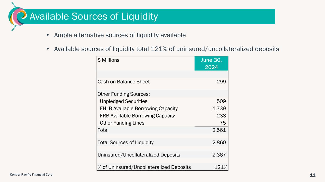 10Central Pacific Financial Corp. High Quality Securities Portfolio • $1.3B or 17% of total assets • 92% AAA rated • Portfolio mix: AFS 52% / HTM 48% • $29.7MM in investment securities purchased in 2Q24 at weighted average yield of 4.73% • Interest rate swap on $115.5MM of municipal securities started on 3/31/24; added $0.9MM to interest income in 2Q24 (pay fixed at 2.1%, receive float at Fed Funds) U.S. Treasury & Gov't Agency 82% Municipals 12% Non-Agency CMBS/RMBS 2% Corporate 3% Other 1% Investment Portfolio Composition as of June 30, 2024