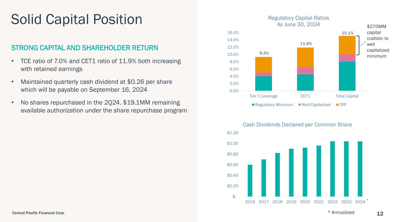 11Central Pacific Financial Corp. • Ample alternative sources of liquidity available • Available sources of liquidity total 121% of uninsured/uncollateralized deposits Available Sources of Liquidity $ Millions June 30, 2024 Cash on Balance Sheet 299 Other Funding Sources: Unpledged Securities 509 FHLB Available Borrowing Capacity 1,739 FRB Available Borrowing Capacity 238 Other Funding Lines 75 Total 2,561 Total Sources of Liquidity 2,860 Uninsured/Uncollateralized Deposits 2,367 % of Uninsured/Uncollateralized Deposits 121%