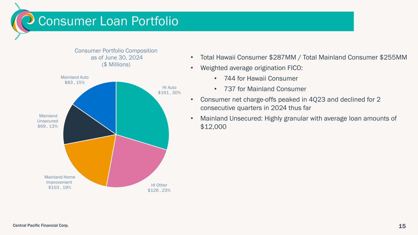 14Central Pacific Financial Corp. Commercial Real Estate Portfolio OFFICE RETAIL TOTAL BALANCE $174.2MM $296.0MM % OF TOTAL CRE 12% 20% % OF TOTAL LOANS 3% 6% WA LTV 55% 65% WA MONTHS TO MATURITY 69 65 INVESTOR / OWNER-OCCUPIED $129.1MM / $45.1MM $218.5MM / $77.5MM • Hawaii 79% / Mainland 21% • Investor 76% / Owner-Occupied 24% Industrial/ Warehouse 27% Retail 20% Apartment 20% Office 12% Hotel 11% Other 5% Shopping Center 3% Storage 2% CRE Portfolio Composition as of June 30, 2024