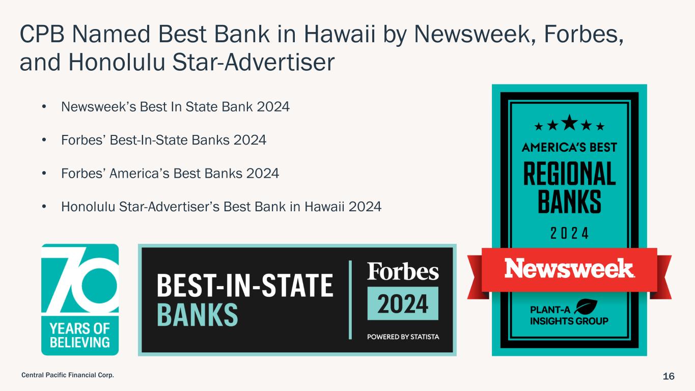 16Central Pacific Financial Corp. CPB Named Best Bank in Hawaii by Newsweek, Forbes, and Honolulu Star-Advertiser • Newsweek’s Best In State Bank 2024 • Forbes’ Best-In-State Banks 2024 • Forbes’ America’s Best Banks 2024 • Honolulu Star-Advertiser’s Best Bank in Hawaii 2024