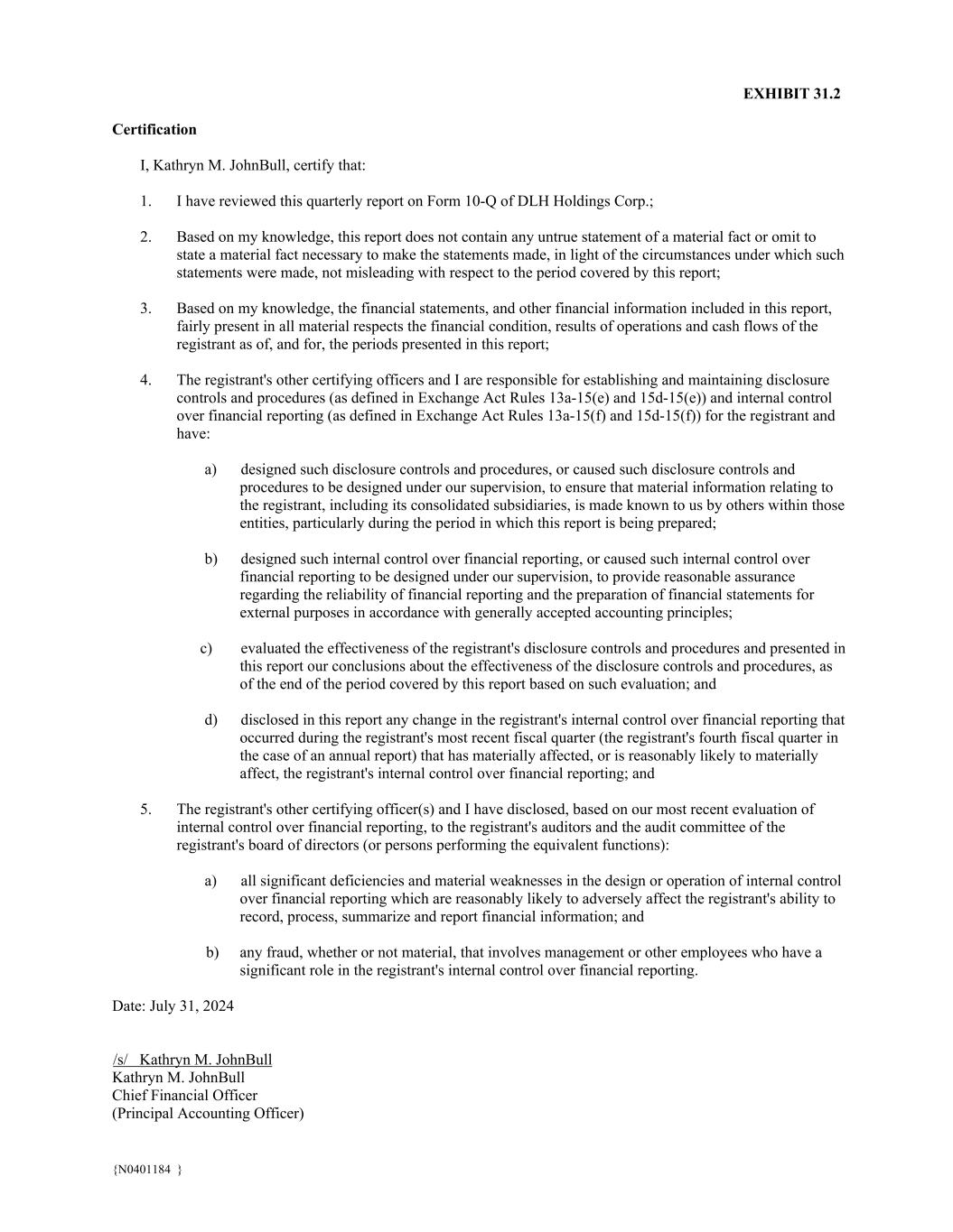{N0401184 } EXHIBIT 31.2 Certification I, Kathryn M. JohnBull, certify that: 1. I have reviewed this quarterly report on Form 10-Q of DLH Holdings Corp.; 2. Based on my knowledge, this report does not contain any untrue statement of a material fact or omit to state a material fact necessary to make the statements made, in light of the circumstances under which such statements were made, not misleading with respect to the period covered by this report; 3. Based on my knowledge, the financial statements, and other financial information included in this report, fairly present in all material respects the financial condition, results of operations and cash flows of the registrant as of, and for, the periods presented in this report; 4. The registrant's other certifying officers and I are responsible for establishing and maintaining disclosure controls and procedures (as defined in Exchange Act Rules 13a-15(e) and 15d-15(e)) and internal control over financial reporting (as defined in Exchange Act Rules 13a-15(f) and 15d-15(f)) for the registrant and have: a) designed such disclosure controls and procedures, or caused such disclosure controls and procedures to be designed under our supervision, to ensure that material information relating to the registrant, including its consolidated subsidiaries, is made known to us by others within those entities, particularly during the period in which this report is being prepared; b) designed such internal control over financial reporting, or caused such internal control over financial reporting to be designed under our supervision, to provide reasonable assurance regarding the reliability of financial reporting and the preparation of financial statements for external purposes in accordance with generally accepted accounting principles; c) evaluated the effectiveness of the registrant's disclosure controls and procedures and presented in this report our conclusions about the effectiveness of the disclosure controls and procedures, as of the end of the period covered by this report based on such evaluation; and d) disclosed in this report any change in the registrant's internal control over financial reporting that occurred during the registrant's most recent fiscal quarter (the registrant's fourth fiscal quarter in the case of an annual report) that has materially affected, or is reasonably likely to materially affect, the registrant's internal control over financial reporting; and 5. The registrant's other certifying officer(s) and I have disclosed, based on our most recent evaluation of internal control over financial reporting, to the registrant's auditors and the audit committee of the registrant's board of directors (or persons performing the equivalent functions): a) all significant deficiencies and material weaknesses in the design or operation of internal control over financial reporting which are reasonably likely to adversely affect the registrant's ability to record, process, summarize and report financial information; and b) any fraud, whether or not material, that involves management or other employees who have a significant role in the registrant's internal control over financial reporting. Date: July 31, 2024 /s/ Kathryn M. JohnBull Kathryn M. JohnBull Chief Financial Officer (Principal Accounting Officer)