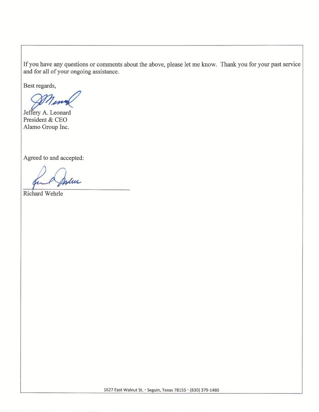 In connection with the Quarterly Report of Alamo Group Inc. (the “Company”) on Form 10-Q for the period ended June 30, 2024 as filed with the Securities and Exchange Commission on the date hereof (the “Report”), I, Jeffery A. Leonard, President & Chief Executive Officer of the Company, certify, pursuant to 18 U.S.C. ss. 1350, as adopted pursuant to ss. 906 of the Sarbanes-Oxley Act of 2002, that: