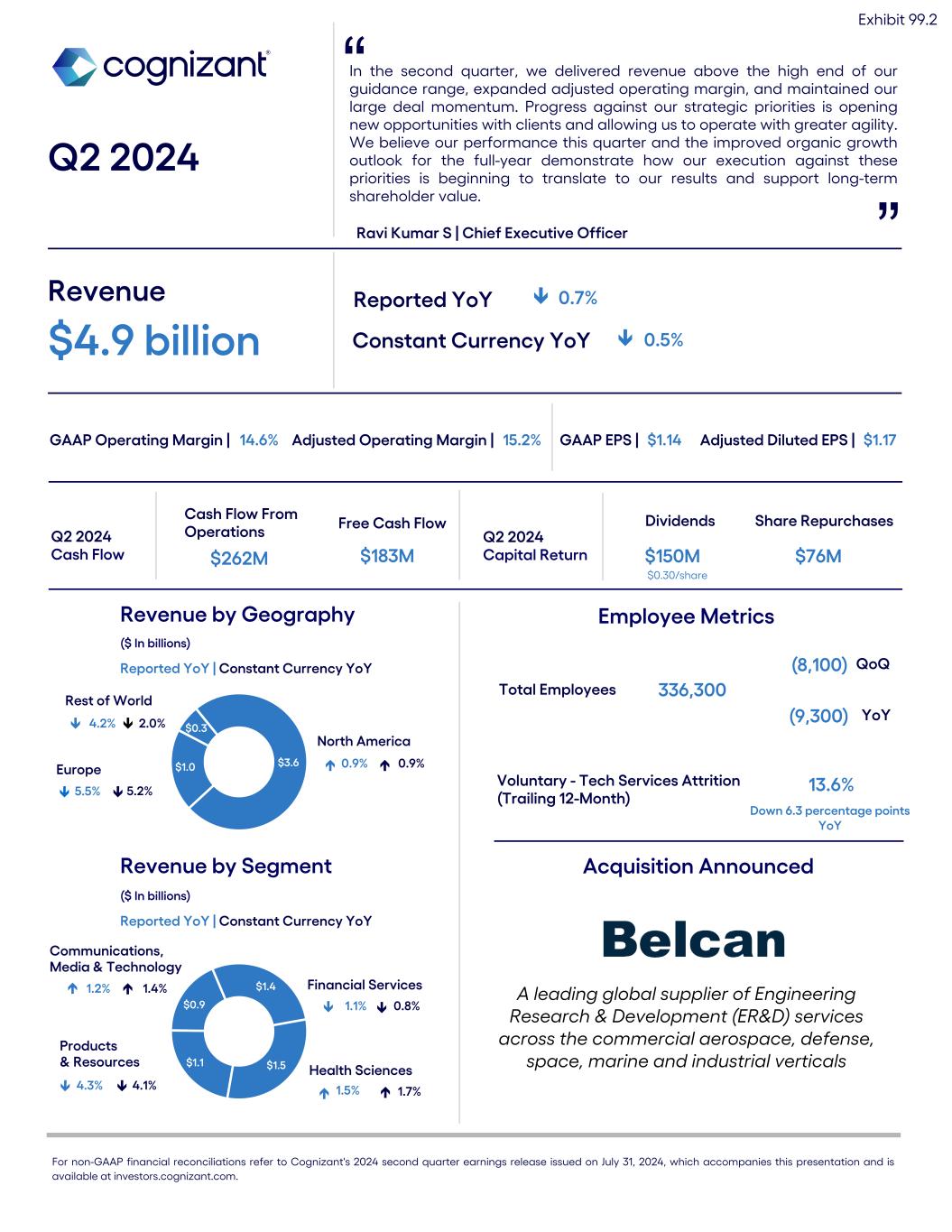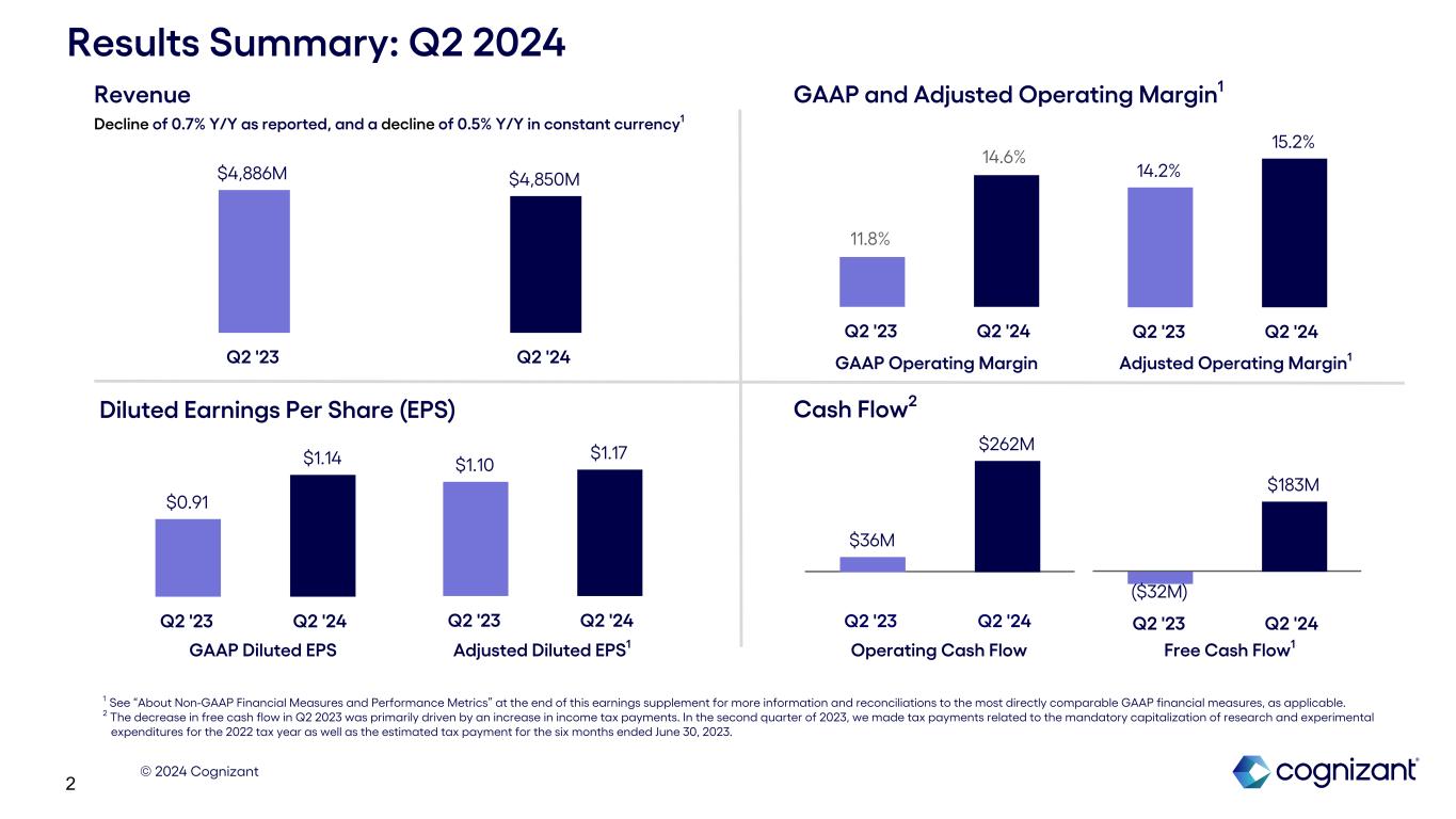In the second quarter, we delivered revenue above the high end of our guidance range, expanded adjusted operating margin, and maintained our large deal momentum. Progress against our strategic priorities is opening new opportunities with clients and allowing us to operate with greater agility. We believe our performance this quarter and the improved organic growth outlook for the full-year demonstrate how our execution against these priorities is beginning to translate to our results and support long-term shareholder value. Q2 2024 Ravi Kumar S | Chief Executive Officer ” Revenue $4.9 billion Reported YoY ê 0.7% Constant Currency YoY ê 0.5% GAAP Operating Margin | 14.6% GAAP EPS | $1.14 $3.6$1.0 $0.3 Rest of World 4.2% Revenue by Geography ($ In billions) Reported YoY | Constant Currency YoY Q2 2024 Cash Flow Cash Flow From Operations $262M Free Cash Flow $183M Q2 2024 Capital Return Dividends $150M Share Repurchases $76M $0.30/share Revenue by Segment ($ In billions) Reported YoY | Constant Currency YoY Europe North America 2.0% $1.4 $1.5$1.1 $0.9 Products & Resources Health Sciences Financial Services Communications, Media & Technology 5.5% 5.2% 0.9% 0.9% 1.2% 1.4% 4.3% 4.1% 1.1% 0.8% 1.5% 1.7% Total Employees 336,300 ” (8,100) QoQ (9,300) YoY Voluntary - Tech Services Attrition (Trailing 12-Month) 13.6% é é é é é é é é é é é Adjusted Diluted EPS | $1.17 Employee Metrics Down 6.3 percentage points YoY Adjusted Operating Margin | 15.2% é é For non-GAAP financial reconciliations refer to Cognizant's 2024 second quarter earnings release issued on July 31, 2024, which accompanies this presentation and is available at investors.cognizant.com. Exhibit 99.2 é Acquisition Announced A leading global supplier of Engineering Research & Development (ER&D) services across the commercial aerospace, defense, space, marine and industrial verticals