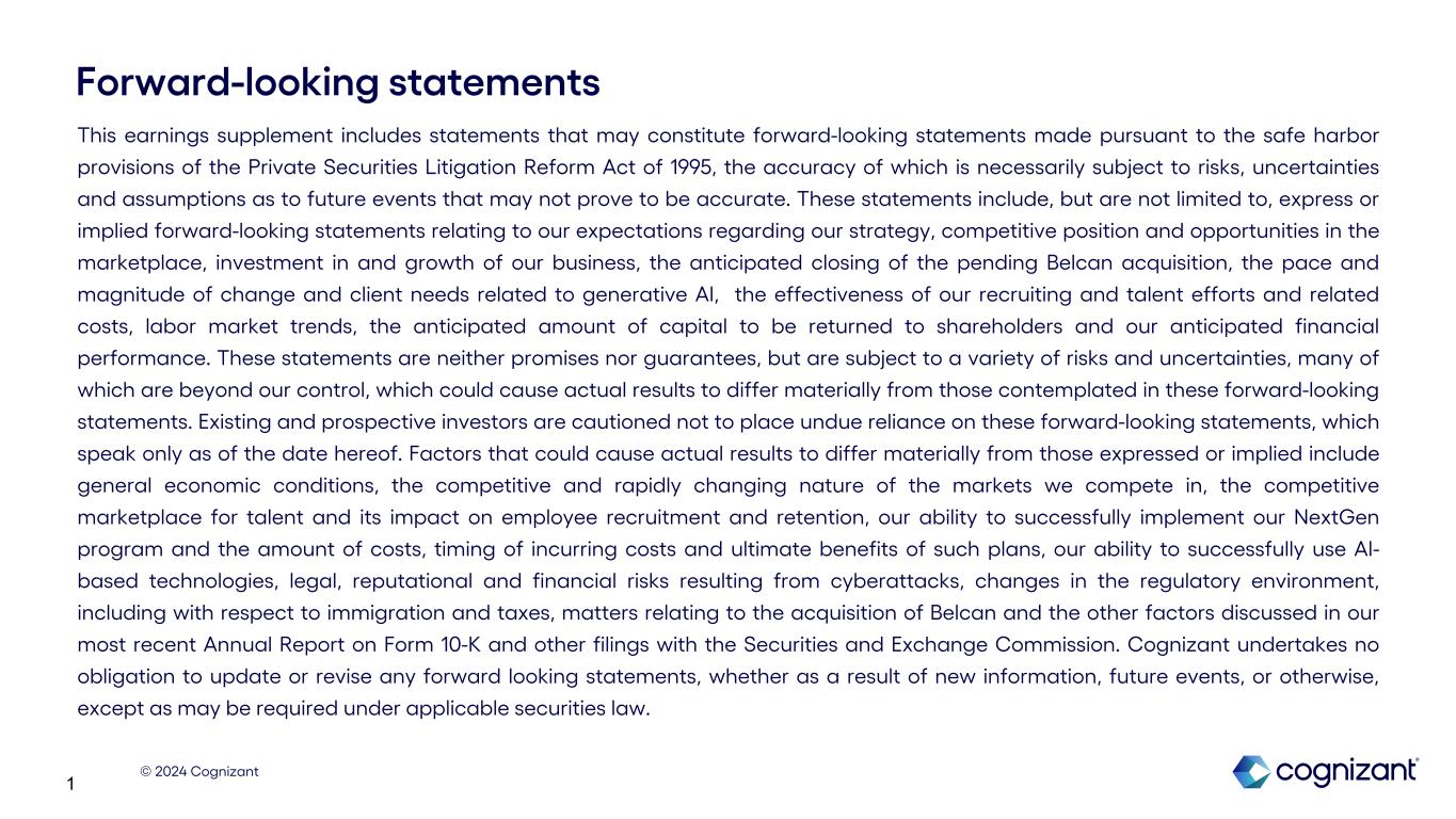 © 2024 Cognizant 1 Forward-looking statements This earnings supplement includes statements that may constitute forward-looking statements made pursuant to the safe harbor provisions of the Private Securities Litigation Reform Act of 1995, the accuracy of which is necessarily subject to risks, uncertainties and assumptions as to future events that may not prove to be accurate. These statements include, but are not limited to, express or implied forward-looking statements relating to our expectations regarding our strategy, competitive position and opportunities in the marketplace, investment in and growth of our business, the anticipated closing of the pending Belcan acquisition, the pace and magnitude of change and client needs related to generative AI, the effectiveness of our recruiting and talent efforts and related costs, labor market trends, the anticipated amount of capital to be returned to shareholders and our anticipated financial performance. These statements are neither promises nor guarantees, but are subject to a variety of risks and uncertainties, many of which are beyond our control, which could cause actual results to differ materially from those contemplated in these forward-looking statements. Existing and prospective investors are cautioned not to place undue reliance on these forward-looking statements, which speak only as of the date hereof. Factors that could cause actual results to differ materially from those expressed or implied include general economic conditions, the competitive and rapidly changing nature of the markets we compete in, the competitive marketplace for talent and its impact on employee recruitment and retention, our ability to successfully implement our NextGen program and the amount of costs, timing of incurring costs and ultimate benefits of such plans, our ability to successfully use AI- based technologies, legal, reputational and financial risks resulting from cyberattacks, changes in the regulatory environment, including with respect to immigration and taxes, matters relating to the acquisition of Belcan and the other factors discussed in our most recent Annual Report on Form 10-K and other filings with the Securities and Exchange Commission. Cognizant undertakes no obligation to update or revise any forward looking statements, whether as a result of new information, future events, or otherwise, except as may be required under applicable securities law.