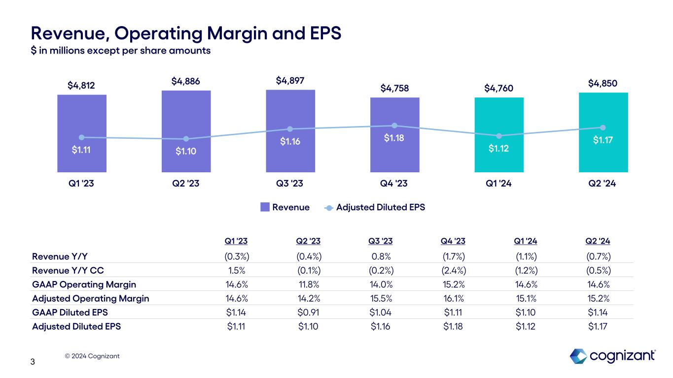© 2024 Cognizant 2 $36M $262M Results Summary: Q2 2024 1 See “About Non-GAAP Financial Measures and Performance Metrics” at the end of this earnings supplement for more information and reconciliations to the most directly comparable GAAP financial measures, as applicable. 2 The decrease in free cash flow in Q2 2023 was primarily driven by an increase in income tax payments. In the second quarter of 2023, we made tax payments related to the mandatory capitalization of research and experimental expenditures for the 2022 tax year as well as the estimated tax payment for the six months ended June 30, 2023. Revenue Decline of 0.7% Y/Y as reported, and a decline of 0.5% Y/Y in constant currency1 GAAP and Adjusted Operating Margin1 Cash Flow2 $4,886M $4,850M Q2 '23 Q2 '24 11.8% 14.6% Q2 '23 Q2 '24 14.2% 15.2% Q2 '23 Q2 '24 ($32M) $183M Q2 '23 Q2 '24 $0.91 $1.14 Q2 '23 Q2 '24 $1.10 $1.17 Q2 '23 Q2 '24 Adjusted Operating Margin1 GAAP Diluted EPS Adjusted Diluted EPS1 Operating Cash Flow Free Cash Flow1 GAAP Operating Margin Adjusted Operating Margin1 Diluted Earnings Per Share (EPS) Q2 '23 Q2 '24