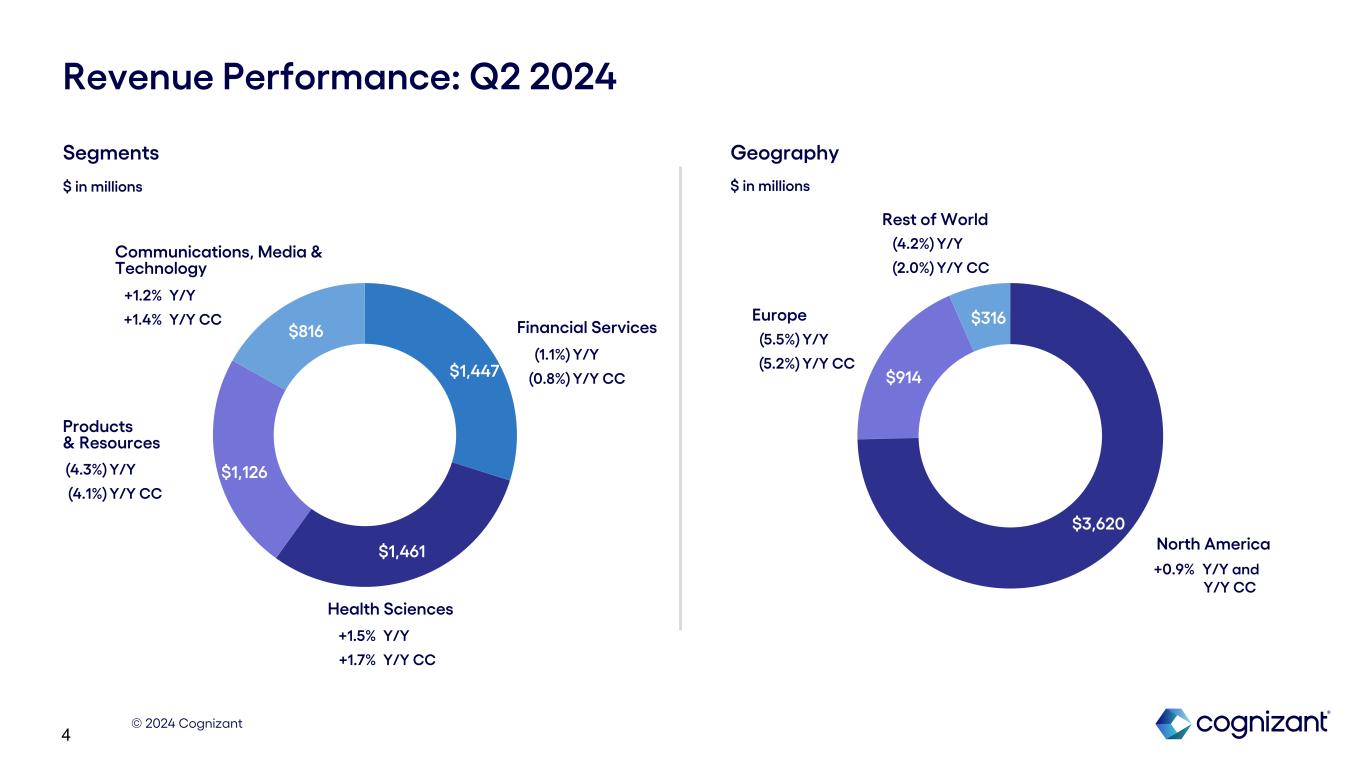 © 2024 Cognizant 3 $4,812 $4,886 $4,897 $4,758 $4,760 $4,850 $1.11 $1.10 $1.16 $1.18 $1.12 $1.17 Revenue Adjusted Diluted EPS Q1 '23 Q2 '23 Q3 '23 Q4 '23 Q1 '24 Q2 '24 $ in millions except per share amounts Q1 '23 Q2 '23 Q3 '23 Q4 '23 Q1 '24 Q2 '24 Revenue Y/Y (0.3%) (0.4%) 0.8% (1.7%) (1.1%) (0.7%) Revenue Y/Y CC 1.5% (0.1%) (0.2%) (2.4%) (1.2%) (0.5%) GAAP Operating Margin 14.6% 11.8% 14.0% 15.2% 14.6% 14.6% Adjusted Operating Margin 14.6% 14.2% 15.5% 16.1% 15.1% 15.2% GAAP Diluted EPS $1.14 $0.91 $1.04 $1.11 $1.10 $1.14 Adjusted Diluted EPS $1.11 $1.10 $1.16 $1.18 $1.12 $1.17 Revenue, Operating Margin and EPS 1