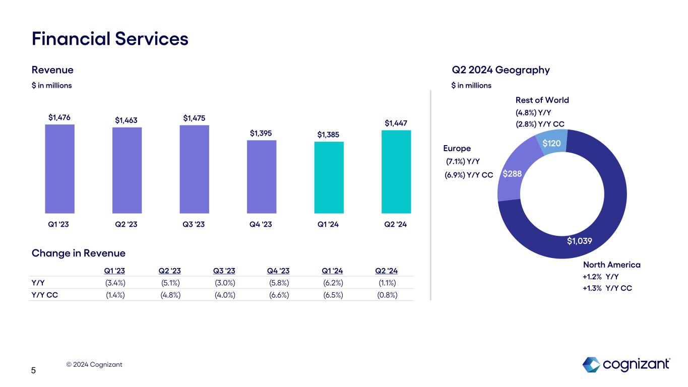 © 2024 Cognizant 4 $3,620 $914 $316 $1,447 $1,461 $1,126 $816 Revenue Performance: Q2 2024 Products & Resources Communications, Media & Technology Health Sciences Financial Services North America Europe Rest of World Segments $ in millions Geography $ in millions +1.2% Y/Y +1.4% Y/Y CC (4.3%) Y/Y (4.1%) Y/Y CC +1.5% Y/Y +1.7% Y/Y CC (1.1%) Y/Y (0.8%) Y/Y CC (5.5%) Y/Y (5.2%) Y/Y CC (4.2%) Y/Y (2.0%) Y/Y CC +0.9% Y/Y and Y/Y CC