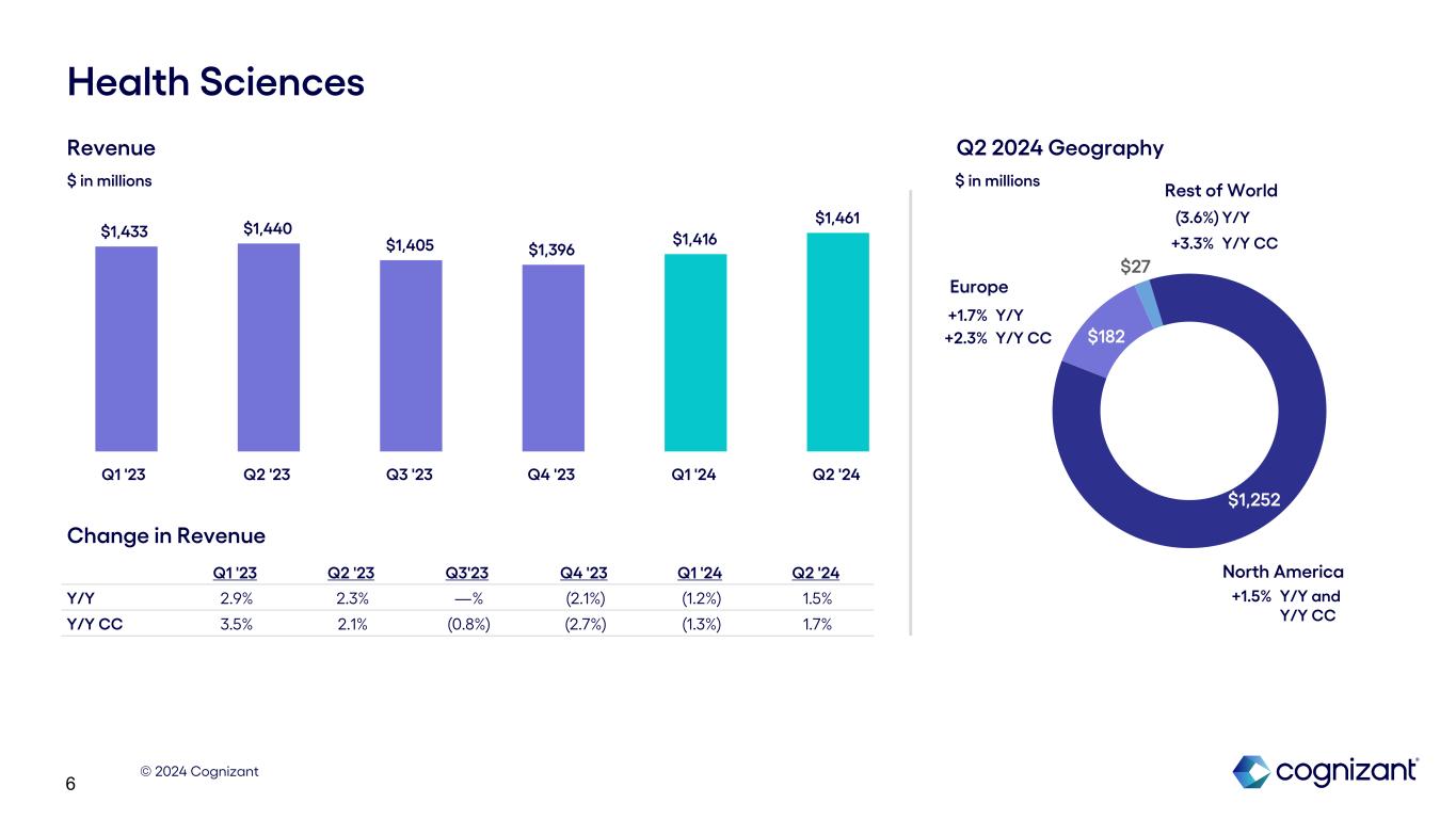 © 2024 Cognizant 5 $1,039 $288 $120 Financial Services North America Europe Rest of World Q1 '23 Q2 '23 Q3 '23 Q4 '23 Q1 '24 Q2 '24 Y/Y (3.4%) (5.1%) (3.0%) (5.8%) (6.2%) (1.1%) Y/Y CC (1.4%) (4.8%) (4.0%) (6.6%) (6.5%) (0.8%) (4.8%) Y/Y (2.8%) Y/Y CC (7.1%) Y/Y (6.9%) Y/Y CC Revenue Change in Revenue $ in millions $ in millions Q2 2024 Geography +1.2% Y/Y +1.3% Y/Y CC $1,476 $1,463 $1,475 $1,395 $1,385 $1,447 Q1 '23 Q2 '23 Q3 '23 Q4 '23 Q1 '24 Q2 '24