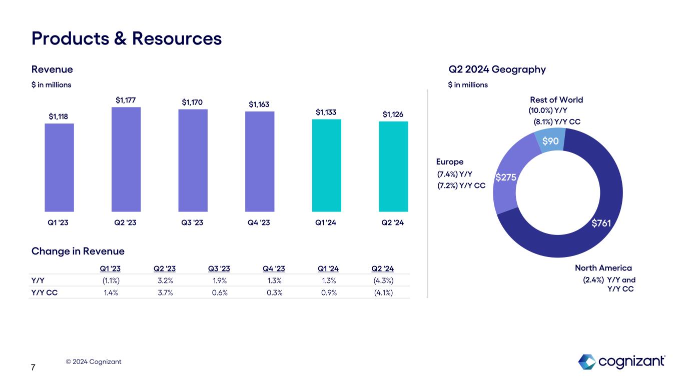 © 2024 Cognizant 6 $1,252 $182 $27 Health Sciences North America Europe Rest of World (3.6%) Y/Y +3.3% Y/Y CC +1.7% Y/Y +2.3% Y/Y CC +1.5% Y/Y and Y/Y CC Revenue $ in millions Q1 '23 Q2 '23 Q3'23 Q4 '23 Q1 '24 Q2 '24 Y/Y 2.9% 2.3% —% (2.1%) (1.2%) 1.5% Y/Y CC 3.5% 2.1% (0.8%) (2.7%) (1.3%) 1.7% $1,433 $1,440 $1,405 $1,396 $1,416 $1,461 Q1 '23 Q2 '23 Q3 '23 Q4 '23 Q1 '24 Q2 '24 Change in Revenue $ in millions Q2 2024 Geography