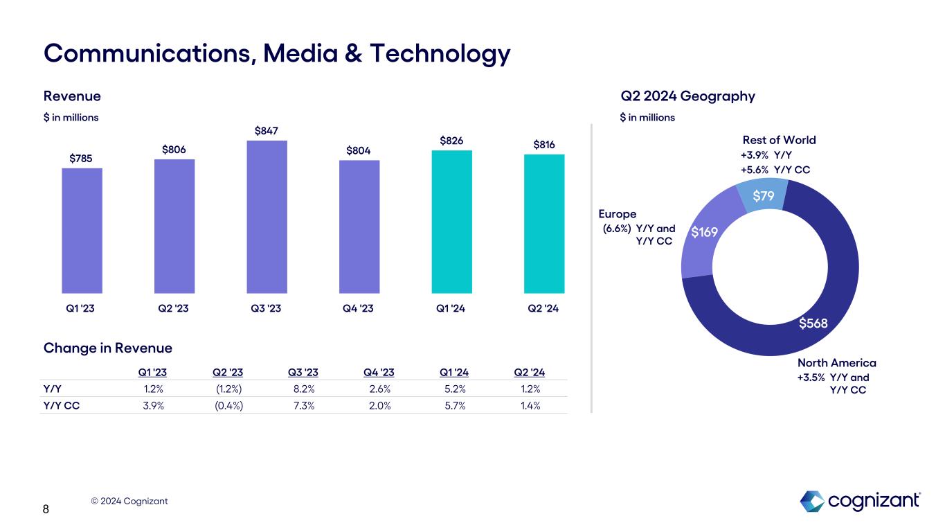 © 2024 Cognizant 7 $761 $275 $90 North America Europe Products & Resources (2.4%) Y/Y and Y/Y CC (7.4%) Y/Y (7.2%) Y/Y CC (10.0%) Y/Y (8.1%) Y/Y CC Rest of World Revenue $ in millions Q1 '23 Q2 '23 Q3 '23 Q4 '23 Q1 '24 Q2 '24 Y/Y (1.1%) 3.2% 1.9% 1.3% 1.3% (4.3%) Y/Y CC 1.4% 3.7% 0.6% 0.3% 0.9% (4.1%) $1,118 $1,177 $1,170 $1,163 $1,133 $1,126 Q1 '23 Q2 '23 Q3 '23 Q4 '23 Q1 '24 Q2 '24 Change in Revenue $ in millions Q2 2024 Geography