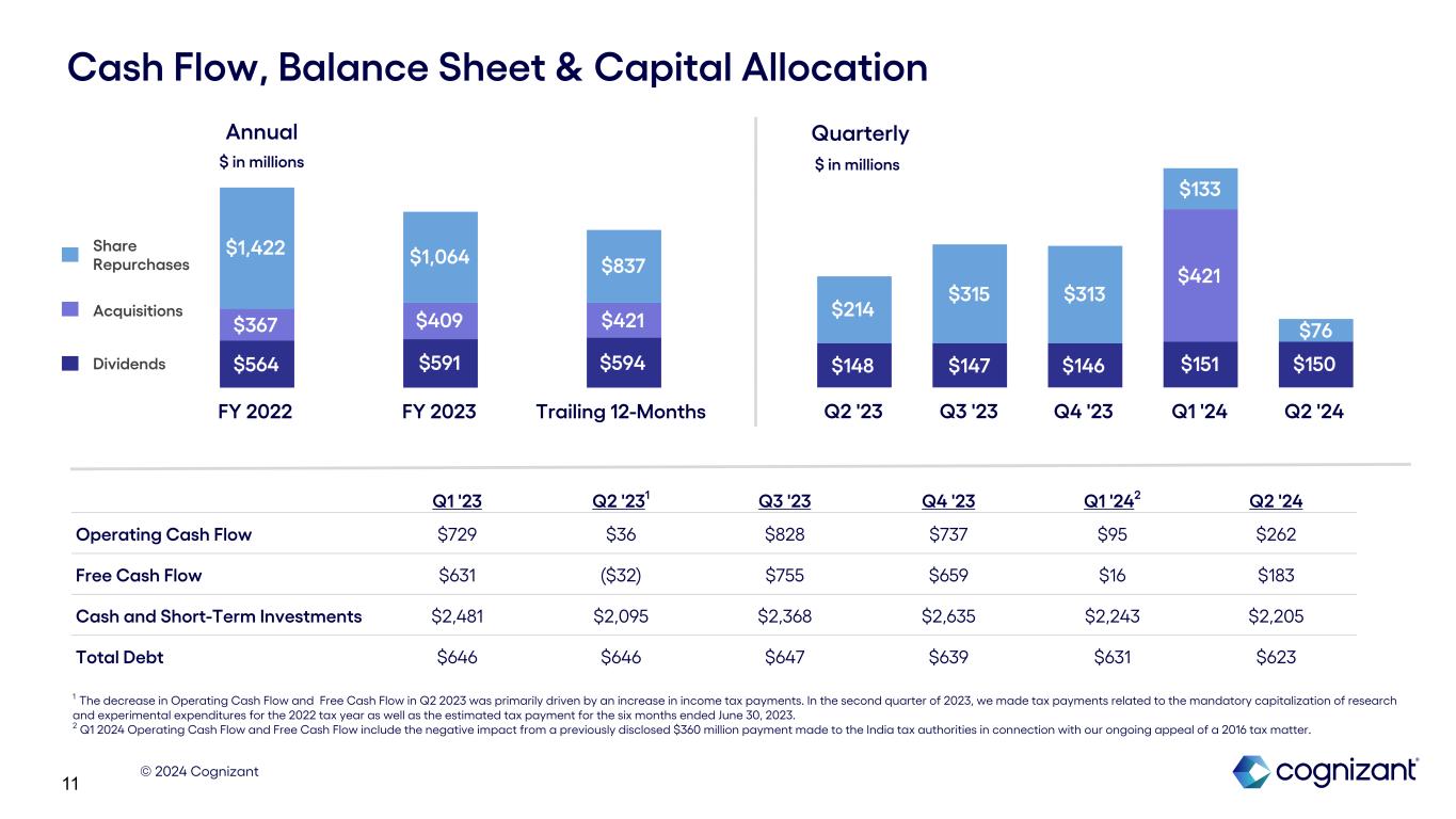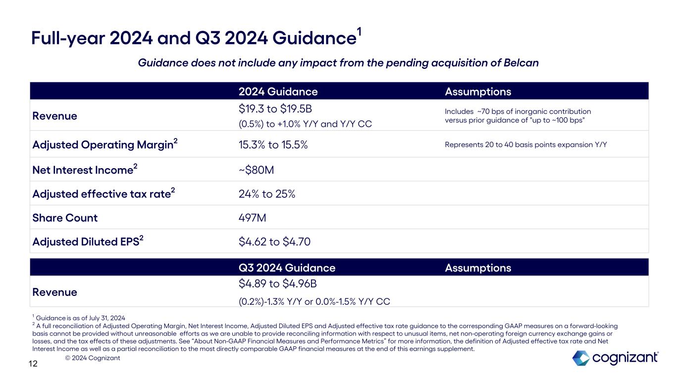 © 2024 Cognizant 11 $564 $591 $594 $367 $409 $421 $1,422 $1,064 $837 FY 2022 FY 2023 Trailing 12-Months Acquisitions Share Repurchases $148 $147 $146 $151 $150 $421 $214 $315 $313 $133 $76 Q2 '23 Q3 '23 Q4 '23 Q1 '24 Q2 '24 Cash Flow, Balance Sheet & Capital Allocation Q1 '23 Q2 '231 Q3 '23 Q4 '23 Q1 '242 Q2 '24 Operating Cash Flow $729 $36 $828 $737 $95 $262 Free Cash Flow $631 ($32) $755 $659 $16 $183 Cash and Short-Term Investments $2,481 $2,095 $2,368 $2,635 $2,243 $2,205 Total Debt $646 $646 $647 $639 $631 $623 Annual Quarterly Dividends $ in millions $ in millions 1 The decrease in Operating Cash Flow and Free Cash Flow in Q2 2023 was primarily driven by an increase in income tax payments. In the second quarter of 2023, we made tax payments related to the mandatory capitalization of research and experimental expenditures for the 2022 tax year as well as the estimated tax payment for the six months ended June 30, 2023. 2 Q1 2024 Operating Cash Flow and Free Cash Flow include the negative impact from a previously disclosed $360 million payment made to the India tax authorities in connection with our ongoing appeal of a 2016 tax matter.