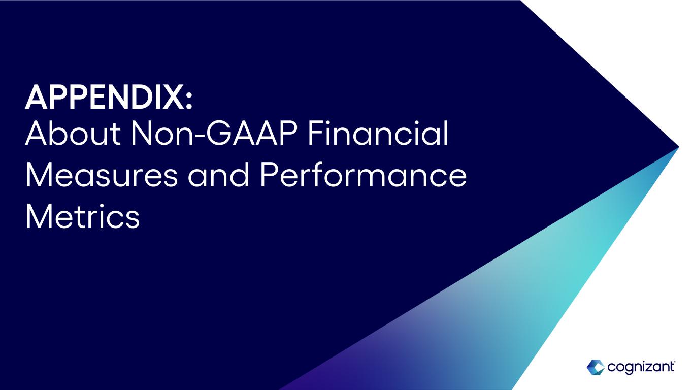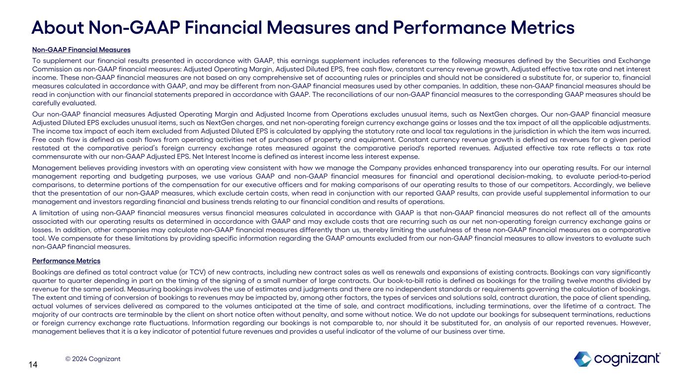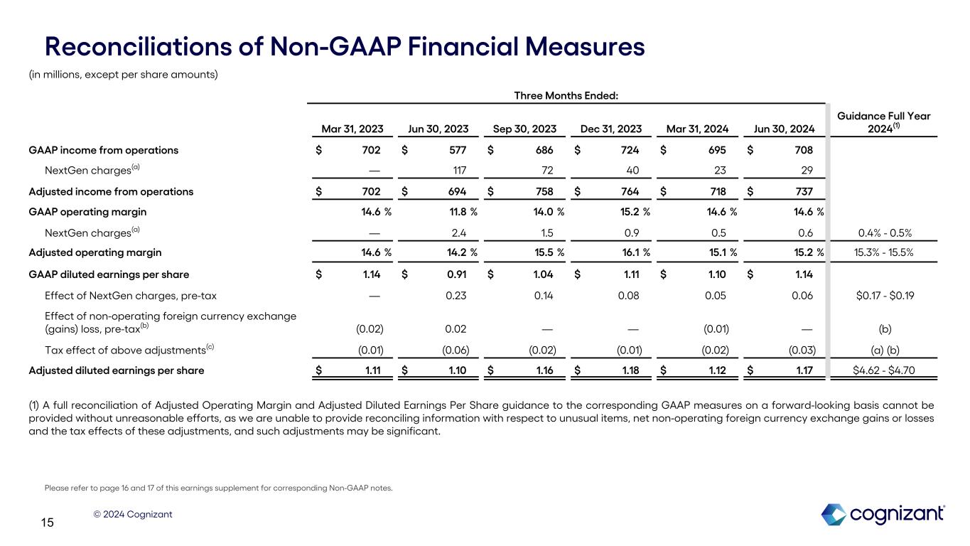 © 2024 Cognizant 14 Non-GAAP Financial Measures To supplement our financial results presented in accordance with GAAP, this earnings supplement includes references to the following measures defined by the Securities and Exchange Commission as non-GAAP financial measures: Adjusted Operating Margin, Adjusted Diluted EPS, free cash flow, constant currency revenue growth, Adjusted effective tax rate and net interest income. These non-GAAP financial measures are not based on any comprehensive set of accounting rules or principles and should not be considered a substitute for, or superior to, financial measures calculated in accordance with GAAP, and may be different from non-GAAP financial measures used by other companies. In addition, these non-GAAP financial measures should be read in conjunction with our financial statements prepared in accordance with GAAP. The reconciliations of our non-GAAP financial measures to the corresponding GAAP measures should be carefully evaluated. Our non-GAAP financial measures Adjusted Operating Margin and Adjusted Income from Operations excludes unusual items, such as NextGen charges. Our non-GAAP financial measure Adjusted Diluted EPS excludes unusual items, such as NextGen charges, and net non-operating foreign currency exchange gains or losses and the tax impact of all the applicable adjustments. The income tax impact of each item excluded from Adjusted Diluted EPS is calculated by applying the statutory rate and local tax regulations in the jurisdiction in which the item was incurred. Free cash flow is defined as cash flows from operating activities net of purchases of property and equipment. Constant currency revenue growth is defined as revenues for a given period restated at the comparative period’s foreign currency exchange rates measured against the comparative period's reported revenues. Adjusted effective tax rate reflects a tax rate commensurate with our non-GAAP Adjusted EPS. Net Interest Income is defined as interest income less interest expense. Management believes providing investors with an operating view consistent with how we manage the Company provides enhanced transparency into our operating results. For our internal management reporting and budgeting purposes, we use various GAAP and non-GAAP financial measures for financial and operational decision-making, to evaluate period-to-period comparisons, to determine portions of the compensation for our executive officers and for making comparisons of our operating results to those of our competitors. Accordingly, we believe that the presentation of our non-GAAP measures, which exclude certain costs, when read in conjunction with our reported GAAP results, can provide useful supplemental information to our management and investors regarding financial and business trends relating to our financial condition and results of operations. A limitation of using non-GAAP financial measures versus financial measures calculated in accordance with GAAP is that non-GAAP financial measures do not reflect all of the amounts associated with our operating results as determined in accordance with GAAP and may exclude costs that are recurring such as our net non-operating foreign currency exchange gains or losses. In addition, other companies may calculate non-GAAP financial measures differently than us, thereby limiting the usefulness of these non-GAAP financial measures as a comparative tool. We compensate for these limitations by providing specific information regarding the GAAP amounts excluded from our non-GAAP financial measures to allow investors to evaluate such non-GAAP financial measures. Performance Metrics Bookings are defined as total contract value (or TCV) of new contracts, including new contract sales as well as renewals and expansions of existing contracts. Bookings can vary significantly quarter to quarter depending in part on the timing of the signing of a small number of large contracts. Our book-to-bill ratio is defined as bookings for the trailing twelve months divided by revenue for the same period. Measuring bookings involves the use of estimates and judgments and there are no independent standards or requirements governing the calculation of bookings. The extent and timing of conversion of bookings to revenues may be impacted by, among other factors, the types of services and solutions sold, contract duration, the pace of client spending, actual volumes of services delivered as compared to the volumes anticipated at the time of sale, and contract modifications, including terminations, over the lifetime of a contract. The majority of our contracts are terminable by the client on short notice often without penalty, and some without notice. We do not update our bookings for subsequent terminations, reductions or foreign currency exchange rate fluctuations. Information regarding our bookings is not comparable to, nor should it be substituted for, an analysis of our reported revenues. However, management believes that it is a key indicator of potential future revenues and provides a useful indicator of the volume of our business over time. About Non-GAAP Financial Measures and Performance Metrics