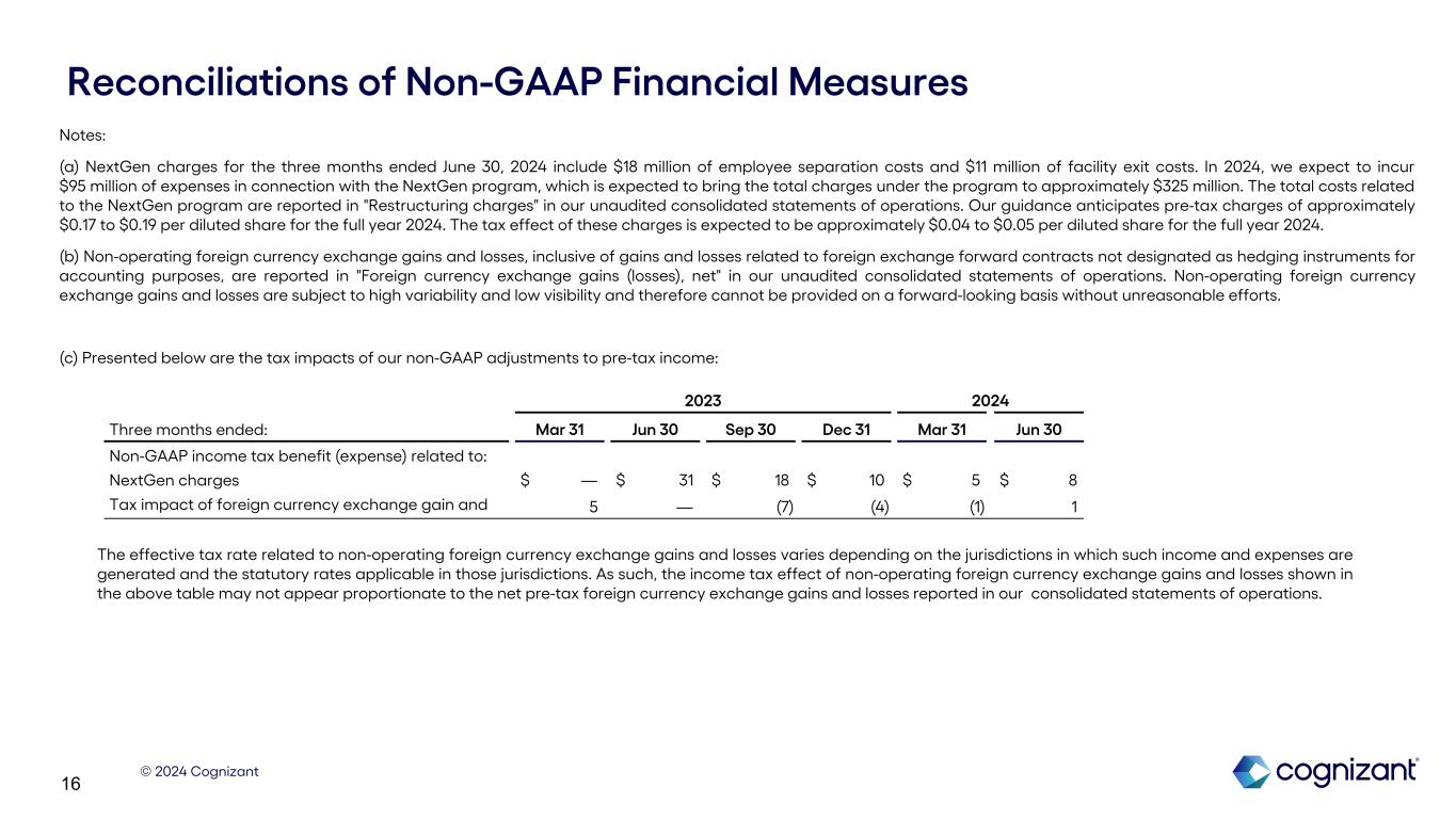 © 2024 Cognizant 15 Reconciliations of Non-GAAP Financial Measures Please refer to page 16 and 17 of this earnings supplement for corresponding Non-GAAP notes. (in millions, except per share amounts) Three Months Ended: Mar 31, 2023 Jun 30, 2023 Sep 30, 2023 Dec 31, 2023 Mar 31, 2024 Jun 30, 2024 Guidance Full Year 2024(1) GAAP income from operations $ 702 $ 577 $ 686 $ 724 $ 695 $ 708 NextGen charges(a) — 117 72 40 23 29 Adjusted income from operations $ 702 $ 694 $ 758 $ 764 $ 718 $ 737 GAAP operating margin 14.6 % 11.8 % 14.0 % 15.2 % 14.6 % 14.6 % NextGen charges(a) — 2.4 1.5 0.9 0.5 0.6 0.4% - 0.5% Adjusted operating margin 14.6 % 14.2 % 15.5 % 16.1 % 15.1 % 15.2 % 15.3% - 15.5% GAAP diluted earnings per share $ 1.14 $ 0.91 $ 1.04 $ 1.11 $ 1.10 $ 1.14 Effect of NextGen charges, pre-tax — 0.23 0.14 0.08 0.05 0.06 $0.17 - $0.19 Effect of non-operating foreign currency exchange (gains) loss, pre-tax(b) (0.02) 0.02 — — (0.01) — (b) Tax effect of above adjustments(c) (0.01) (0.06) (0.02) (0.01) (0.02) (0.03) (a) (b) Adjusted diluted earnings per share $ 1.11 $ 1.10 $ 1.16 $ 1.18 $ 1.12 $ 1.17 $4.62 - $4.70 (1) A full reconciliation of Adjusted Operating Margin and Adjusted Diluted Earnings Per Share guidance to the corresponding GAAP measures on a forward-looking basis cannot be provided without unreasonable efforts, as we are unable to provide reconciling information with respect to unusual items, net non-operating foreign currency exchange gains or losses and the tax effects of these adjustments, and such adjustments may be significant.