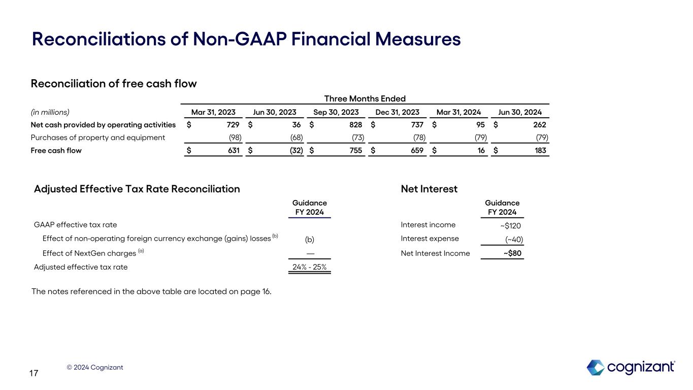© 2024 Cognizant 16 Reconciliations of Non-GAAP Financial Measures Notes: (a) NextGen charges for the three months ended June 30, 2024 include $18 million of employee separation costs and $11 million of facility exit costs. In 2024, we expect to incur $95 million of expenses in connection with the NextGen program, which is expected to bring the total charges under the program to approximately $325 million. The total costs related to the NextGen program are reported in "Restructuring charges" in our unaudited consolidated statements of operations. Our guidance anticipates pre-tax charges of approximately $0.17 to $0.19 per diluted share for the full year 2024. The tax effect of these charges is expected to be approximately $0.04 to $0.05 per diluted share for the full year 2024. (b) Non-operating foreign currency exchange gains and losses, inclusive of gains and losses related to foreign exchange forward contracts not designated as hedging instruments for accounting purposes, are reported in "Foreign currency exchange gains (losses), net" in our unaudited consolidated statements of operations. Non-operating foreign currency exchange gains and losses are subject to high variability and low visibility and therefore cannot be provided on a forward-looking basis without unreasonable efforts. 2023 2024 Three months ended: Mar 31 Jun 30 Sep 30 Dec 31 Mar 31 Jun 30 Non-GAAP income tax benefit (expense) related to: NextGen charges $ — $ 31 $ 18 $ 10 $ 5 $ 8 Tax impact of foreign currency exchange gain and losses 5 — (7) (4) (1) 1 (c) Presented below are the tax impacts of our non-GAAP adjustments to pre-tax income: The effective tax rate related to non-operating foreign currency exchange gains and losses varies depending on the jurisdictions in which such income and expenses are generated and the statutory rates applicable in those jurisdictions. As such, the income tax effect of non-operating foreign currency exchange gains and losses shown in the above table may not appear proportionate to the net pre-tax foreign currency exchange gains and losses reported in our consolidated statements of operations.