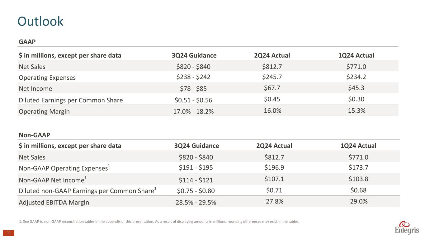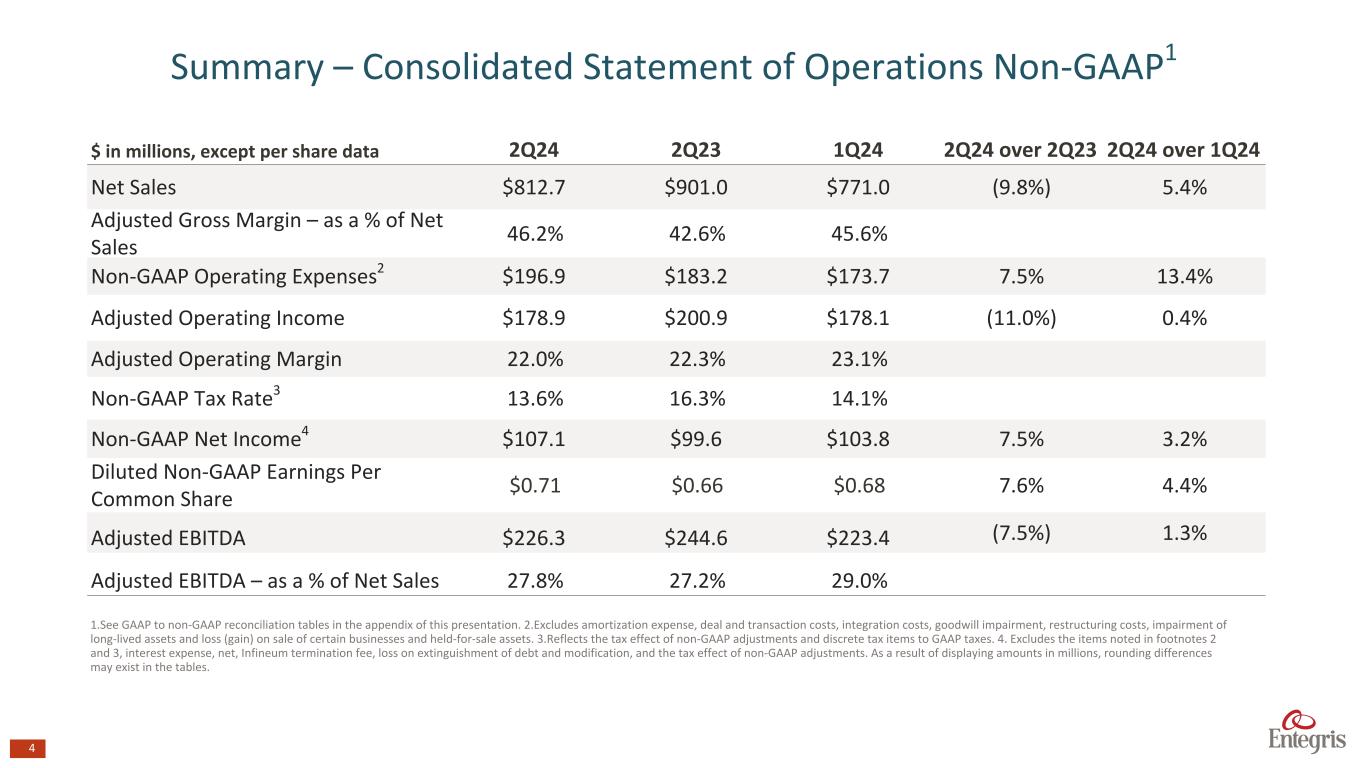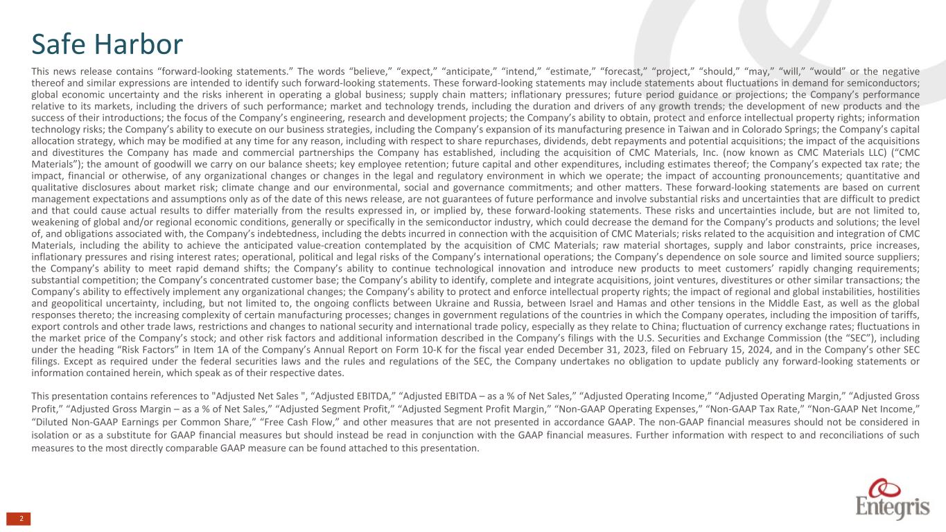 This news release contains “forward-looking statements.” The words “believe,” “expect,” “anticipate,” “intend,” “estimate,” “forecast,” “project,” “should,” “may,” “will,” “would” or the negative thereof and similar expressions are intended to identify such forward-looking statements. These forward-looking statements may include statements about fluctuations in demand for semiconductors; global economic uncertainty and the risks inherent in operating a global business; supply chain matters; inflationary pressures; future period guidance or projections; the Company’s performance relative to its markets, including the drivers of such performance; market and technology trends, including the duration and drivers of any growth trends; the development of new products and the success of their introductions; the focus of the Company’s engineering, research and development projects; the Company’s ability to obtain, protect and enforce intellectual property rights; information technology risks; the Company’s ability to execute on our business strategies, including the Company’s expansion of its manufacturing presence in Taiwan and in Colorado Springs; the Company’s capital allocation strategy, which may be modified at any time for any reason, including with respect to share repurchases, dividends, debt repayments and potential acquisitions; the impact of the acquisitions and divestitures the Company has made and commercial partnerships the Company has established, including the acquisition of CMC Materials, Inc. (now known as CMC Materials LLC) (“CMC Materials”); the amount of goodwill we carry on our balance sheets; key employee retention; future capital and other expenditures, including estimates thereof; the Company’s expected tax rate; the impact, financial or otherwise, of any organizational changes or changes in the legal and regulatory environment in which we operate; the impact of accounting pronouncements; quantitative and qualitative disclosures about market risk; climate change and our environmental, social and governance commitments; and other matters. These forward-looking statements are based on current management expectations and assumptions only as of the date of this news release, are not guarantees of future performance and involve substantial risks and uncertainties that are difficult to predict and that could cause actual results to differ materially from the results expressed in, or implied by, these forward-looking statements. These risks and uncertainties include, but are not limited to, weakening of global and/or regional economic conditions, generally or specifically in the semiconductor industry, which could decrease the demand for the Company’s products and solutions; the level of, and obligations associated with, the Company’s indebtedness, including the debts incurred in connection with the acquisition of CMC Materials; risks related to the acquisition and integration of CMC Materials, including the ability to achieve the anticipated value-creation contemplated by the acquisition of CMC Materials; raw material shortages, supply and labor constraints, price increases, inflationary pressures and rising interest rates; operational, political and legal risks of the Company’s international operations; the Company’s dependence on sole source and limited source suppliers; the Company’s ability to meet rapid demand shifts; the Company’s ability to continue technological innovation and introduce new products to meet customers’ rapidly changing requirements; substantial competition; the Company’s concentrated customer base; the Company’s ability to identify, complete and integrate acquisitions, joint ventures, divestitures or other similar transactions; the Company’s ability to effectively implement any organizational changes; the Company’s ability to protect and enforce intellectual property rights; the impact of regional and global instabilities, hostilities and geopolitical uncertainty, including, but not limited to, the ongoing conflicts between Ukraine and Russia, between Israel and Hamas and other tensions in the Middle East, as well as the global responses thereto; the increasing complexity of certain manufacturing processes; changes in government regulations of the countries in which the Company operates, including the imposition of tariffs, export controls and other trade laws, restrictions and changes to national security and international trade policy, especially as they relate to China; fluctuation of currency exchange rates; fluctuations in the market price of the Company’s stock; and other risk factors and additional information described in the Company’s filings with the U.S. Securities and Exchange Commission (the “SEC”), including under the heading “Risk Factors” in Item 1A of the Company’s Annual Report on Form 10-K for the fiscal year ended December 31, 2023, filed on February 15, 2024, and in the Company’s other SEC filings. Except as required under the federal securities laws and the rules and regulations of the SEC, the Company undertakes no obligation to update publicly any forward-looking statements or information contained herein, which speak as of their respective dates. This presentation contains references to "Adjusted Net Sales ", “Adjusted EBITDA,” “Adjusted EBITDA – as a % of Net Sales,” “Adjusted Operating Income,” “Adjusted Operating Margin,” “Adjusted Gross Profit,” “Adjusted Gross Margin – as a % of Net Sales,” “Adjusted Segment Profit,” “Adjusted Segment Profit Margin,” “Non-GAAP Operating Expenses,” “Non-GAAP Tax Rate,” “Non-GAAP Net Income,” “Diluted Non-GAAP Earnings per Common Share,” “Free Cash Flow,” and other measures that are not presented in accordance GAAP. The non-GAAP financial measures should not be considered in isolation or as a substitute for GAAP financial measures but 