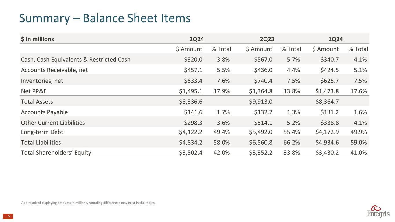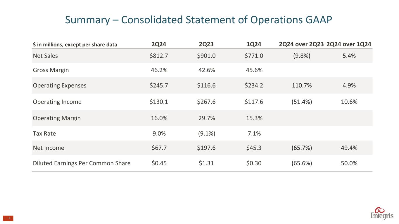 BILLERICA, Mass., July 31, 2024 - Entegris, Inc. (NASDAQ: ENTG), today reported its financial results for the Company’s second quarter ended June 29, 2024.