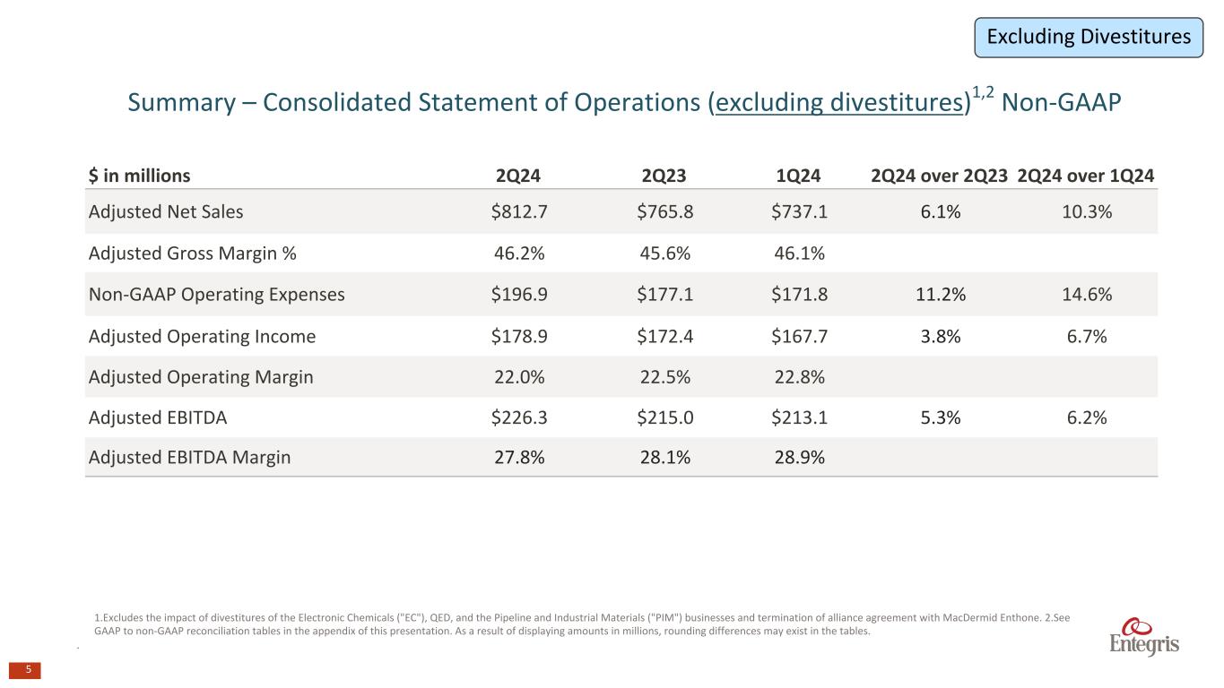 4 $ in millions, except per share data 2Q24 2Q23 1Q24 2Q24 over 2Q23 2Q24 over 1Q24 Net Sales $812.7 $901.0 $771.0 (9.8%) 5.4% Adjusted Gross Margin – as a % of Net Sales 46.2% 42.6% 45.6% Non-GAAP Operating Expenses2 $196.9 $183.2 $173.7 7.5% 13.4% Adjusted Operating Income $178.9 $200.9 $178.1 (11.0%) 0.4% Adjusted Operating Margin 22.0% 22.3% 23.1% Non-GAAP Tax Rate3 13.6% 16.3% 14.1% Non-GAAP Net Income4 $107.1 $99.6 $103.8 7.5% 3.2% Diluted Non-GAAP Earnings Per Common Share $0.71 $0.66 $0.68 7.6% 4.4% Adjusted EBITDA $226.3 $244.6 $223.4 (7.5%) 1.3% Adjusted EBITDA – as a % of Net Sales 27.8% 27.2% 29.0% Summary – Consolidated Statement of Operations Non-GAAP1 1.See GAAP to non-GAAP reconciliation tables in the appendix of this presentation. 2.Excludes amortization expense, deal and transaction costs, integration costs, goodwill impairment, restructuring costs, impairment of long-lived assets and loss (gain) on sale of certain businesses and held-for-sale assets. 3.Reflects the tax effect of non-GAAP adjustments and discrete tax items to GAAP taxes. 4. Excludes the items noted in footnotes 2 and 3, interest expense, net, Infineum termination fee, loss on extinguishment of debt and modification, and the tax effect of non-GAAP adjustments. As a result of displaying amounts in millions, rounding differences may exist in the tables.