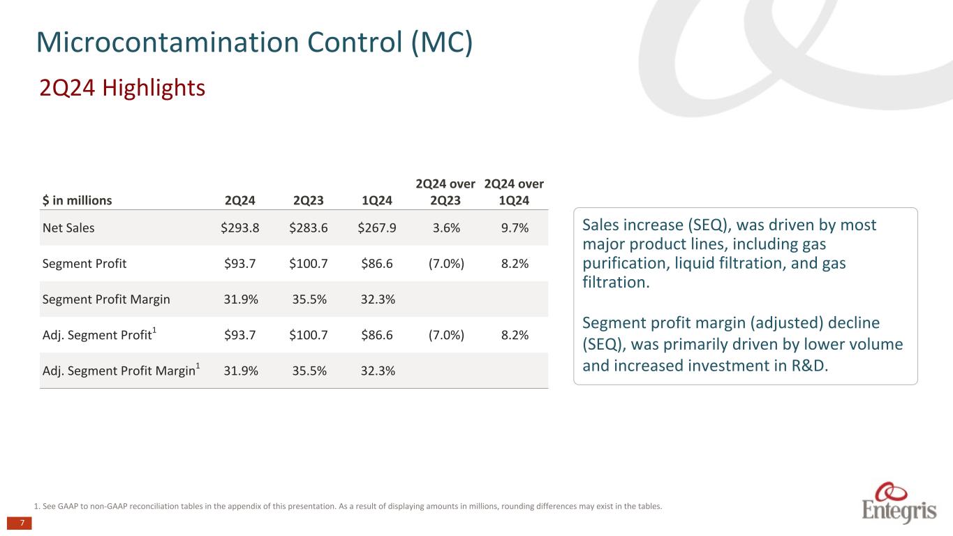 6 1. Excludes the impact of divestitures of the Electronic Chemicals ("EC"), QED, and the Pipeline and Industrial Materials ("PIM") businesses and termination of the alliance agreement with MacDermid Enthone. 2. See GAAP to non-GAAP reconciliation tables in the appendix of this presentation. As a result of displaying amounts in millions, rounding differences may exist in the tables. . Adjusted sales (ex. divestitures) increase (SEQ), was driven primarily by CMP slurries and Pads (benefiting from improving trends in memory), specialty coatings and etching chemistries. Segment profit margin (adjusted and ex. divestitures) increase (SEQ), was driven by higher sales volumes, partially offset by increased R&D spending. $ in millions 2Q24 2Q23 1Q24 2Q24 over 2Q23 2Q24 over 1Q24 Net Sales $342.3 $440.6 $350.0 (22.3%) (2.2%) Adjusted Net Sales (ex. divestitures)1 $342.3 $305.4 $316.1 12.1% 8.3% Segment Profit $70.3 $215.7 $67.1 (67.4%) 4.8% Segment Profit Margin 20.5% 49.0% 19.2% Adj. Segment Profit2 $70.8 $75.9 $75.2 (6.7%) (5.9%) Adj. Segment Profit Margin2 20.7% 17.2% 21.5% Adj. Segment Profit Margin (ex. divestitures)1 20.7% 15.5% 20.5% Materials Solutions (MS) 2Q24 Highlights