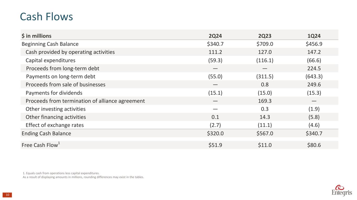 9 $ in millions 2Q24 2Q23 1Q24 $ Amount % Total $ Amount % Total $ Amount % Total Cash, Cash Equivalents & Restricted Cash $320.0 3.8% $567.0 5.7% $340.7 4.1% Accounts Receivable, net $457.1 5.5% $436.0 4.4% $424.5 5.1% Inventories, net $633.4 7.6% $740.4 7.5% $625.7 7.5% Net PP&E $1,495.1 17.9% $1,364.8 13.8% $1,473.8 17.6% Total Assets $8,336.6 $9,913.0 $8,364.7 Accounts Payable $141.6 1.7% $132.2 1.3% $131.2 1.6% Other Current Liabilities $298.3 3.6% $514.1 5.2% $338.8 4.1% Long-term Debt $4,122.2 49.4% $5,492.0 55.4% $4,172.9 49.9% Total Liabilities $4,834.2 58.0% $6,560.8 66.2% $4,934.6 59.0% Total Shareholders’ Equity $3,502.4 42.0% $3,352.2 33.8% $3,430.2 41.0% Summary – Balance Sheet Items As a result of displaying amounts in millions, rounding differences may exist in the tables.