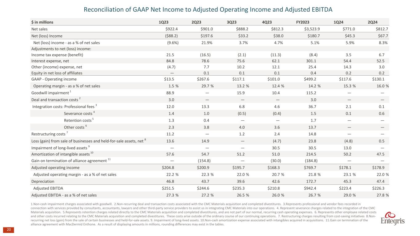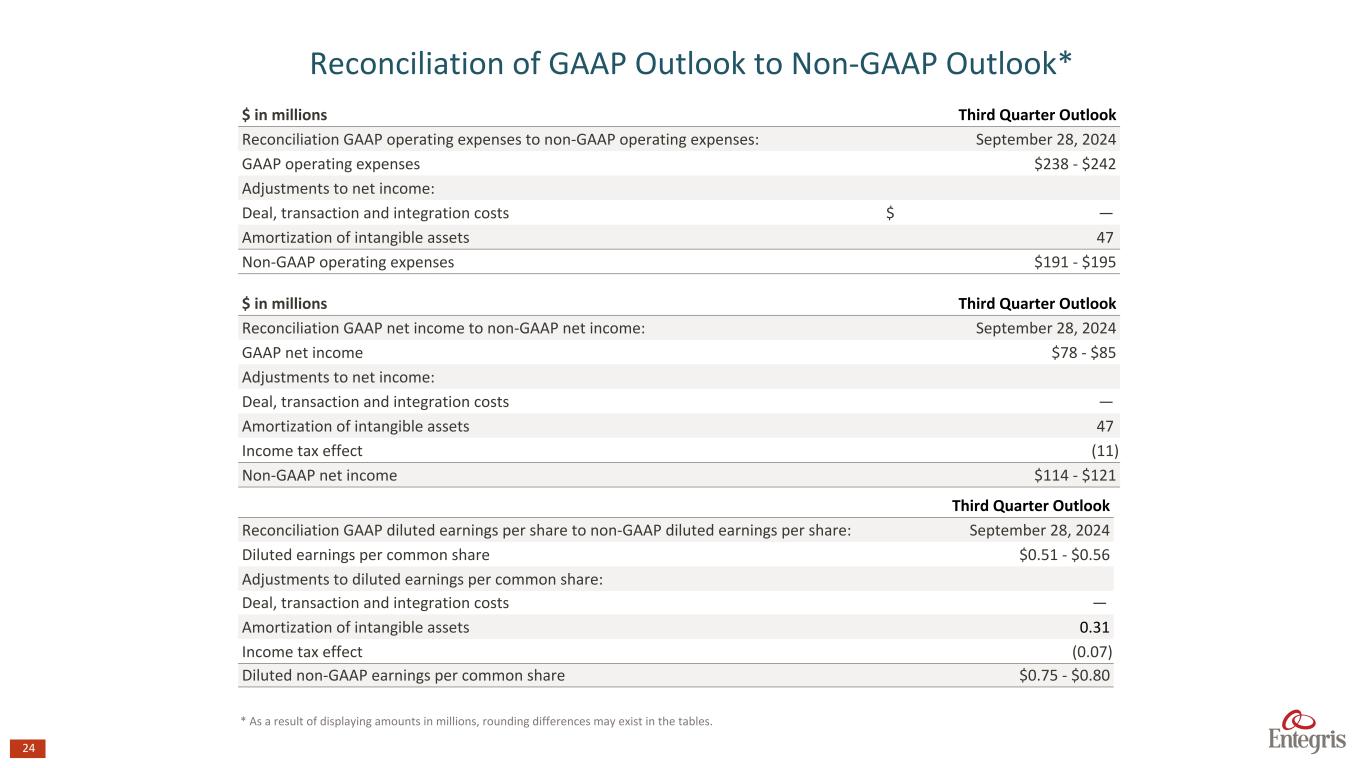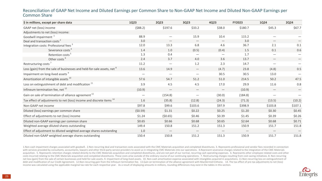 23 $ in millions, except per share data 1Q23 2Q23 3Q23 4Q23 FY2023 1Q24 2Q24 GAAP net (loss) income ($88.2) $197.6 $33.2 $38.0 $180.7 $45.3 $67.7 Adjustments to net (loss) income: Goodwill impairment 1 88.9 — 15.9 10.4 115.2 — — Deal and transaction costs 2 3.0 — — — 3.0 — — Integration costs: Professional fees 3 12.0 13.3 6.8 4.6 36.7 2.1 0.1 Severance costs 4 1.4 1.0 (0.5) (0.4) 1.5 0.1 0.6 Retention costs 5 1.3 0.4 — — 1.7 — — Other costs 6 2.4 3.7 4.0 3.6 13.7 — — Restructuring costs 7 11.2 — 1.2 2.3 14.7 — — Loss (gain) from the sale of businesses and held-for-sale assets, net 8 13.6 14.9 — (4.7) 23.8 (4.8) 0.5 Impairment on long-lived assets 9 — — — 30.5 30.5 13.0 — Amortization of intangible assets 10 57.6 54.7 51.2 51.0 214.5 50.2 47.5 Loss on extinguishment of debt and modification 11 3.9 4.5 4.5 17.0 29.9 11.6 0.8 Infineum termination fee, net 12 (10.9) — — — (10.9) — — Gain on sale of termination of alliance agreement 13 — (154.8) — (30.0) (184.8) — — Tax effect of adjustments to net (loss) income and discrete items 14 1.6 (35.8) (12.8) (24.3) (71.3) (13.5) (10.2) Non-GAAP net income $97.8 $99.6 $103.6 $97.9 $398.9 $103.8 $107.1 Diluted (loss) earnings per common share ($0.59) $1.31 $0.22 $0.25 $1.20 $0.30 $0.45 Effect of adjustments to net (loss) income $1.24 ($0.65) $0.46 $0.39 $1.45 $0.39 $0.26 Diluted non-GAAP earnings per common share $0.65 $0.66 $0.68 $0.65 $2.64 $0.68 $0.71 Weighted average diluted shares outstanding 149.4 150.8 151.2 151.3 150.9 151.7 151.8 Effect of adjustment to diluted weighted average shares outstanding 1.0 — — — — — — Diluted non-GAAP weighted average shares outstanding 150.4 150.8 151.2 151.3 150.9 151.7 151.8 Reconciliation of GAAP Net Income and Diluted Earnings per Common Share to Non-GAAP Net Income and Diluted Non-GAAP Earnings per Common Share 1.Non-cash impairment charges associated with goodwill. 2.Non-recurring deal and transaction costs associated with the CMC Materials acquisition and completed divestitures. 3. Represents professional and vendor fees recorded in connection with services provided by consultants, accountants, lawyers and other third-party service providers to assist us in integrating CMC Materials into our operations. 4.Represent severance charges related to the integration of the CMC Materials acquisition. 5. Represents retention charges related directly to the CMC Materials acquisition and completed divestitures, and are not part of our normal, recurring cash operating expenses. 6. Represents other employee related costs and other costs incurred relating to the CMC Materials acquisition and completed divestitures. These costs arise outside of the ordinary course of our continuing operations. 7. Restructuring charges resulting from cost-saving initiatives. 8. Non-recurring net loss (gain) from the sale of certain businesses and held-for-sale assets. 9. Impairment of long-lived assets. 10. Non-cash amortization expense associated with intangibles acquired in acquisitions. 11.Non-recurring loss on extinguishment of debt and modification of our Credit Agreement. 12.Non-recurring gain from the Infineum termination fee. 13.Gain on termination of the alliance agreement with MacDermid Enthone. 14. The tax effect of pre-tax adjustments to net (loss) income was calculated using the applicable marginal tax rate for each respective year. As a result of displaying amounts in millions, rounding differences may exist in the tables in this section.