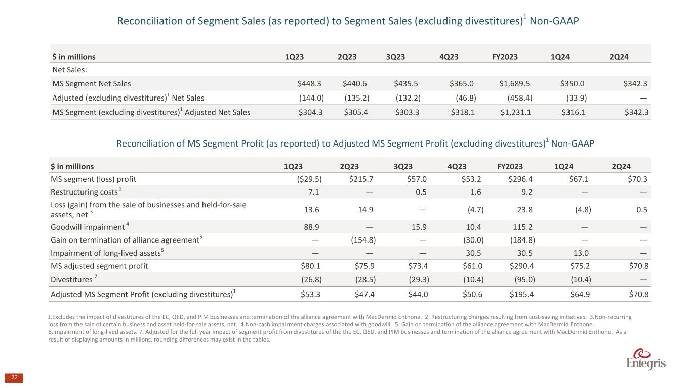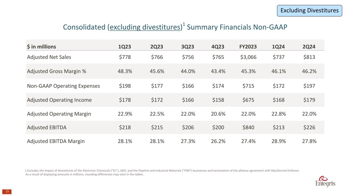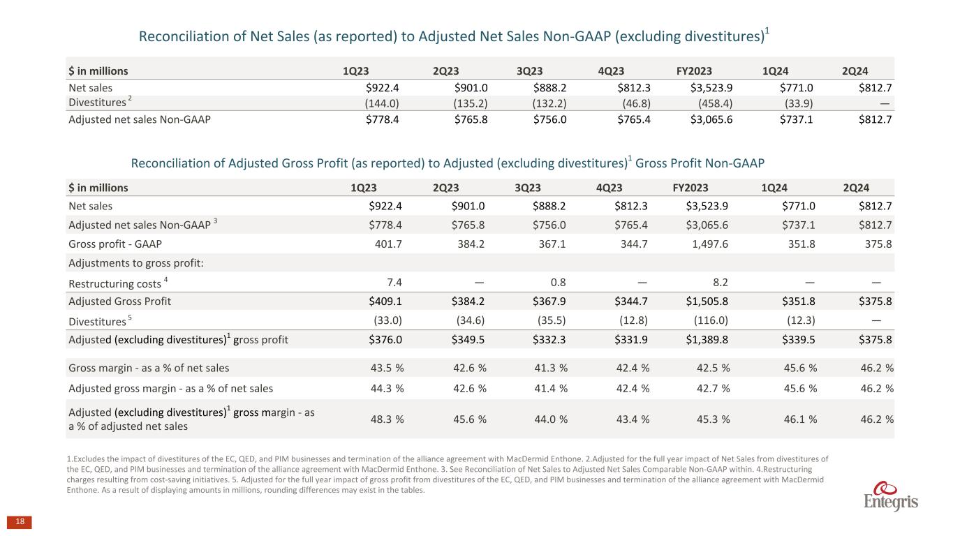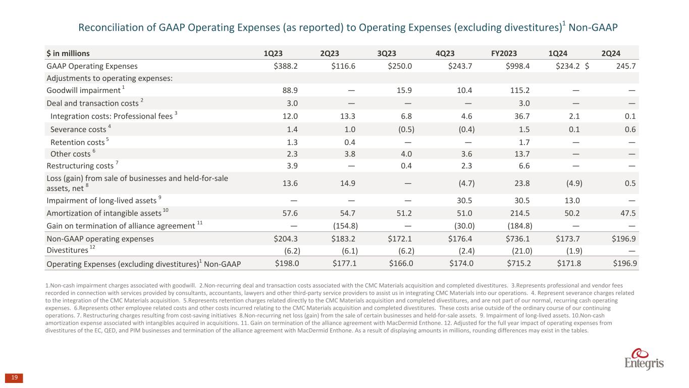 23 $ in millions, except per share data 1Q23 2Q23 3Q23 4Q23 FY2023 1Q24 2Q24 GAAP net (loss) income ($88.2) $197.6 $33.2 $38.0 $180.7 $45.3 $67.7 Adjustments to net (loss) income: Goodwill impairment 1 88.9 — 15.9 10.4 115.2 — — Deal and transaction costs 2 3.0 — — — 3.0 — — Integration costs: Professional fees 3 12.0 13.3 6.8 4.6 36.7 2.1 0.1 Severance costs 4 1.4 1.0 (0.5) (0.4) 1.5 0.1 0.6 Retention costs 5 1.3 0.4 — — 1.7 — — Other costs 6 2.4 3.7 4.0 3.6 13.7 — — Restructuring costs 7 11.2 — 1.2 2.3 14.7 — — Loss (gain) from the sale of businesses and held-for-sale assets, net 8 13.6 14.9 — (4.7) 23.8 (4.8) 0.5 Impairment on long-lived assets 9 — — — 30.5 30.5 13.0 — Amortization of intangible assets 10 57.6 54.7 51.2 51.0 214.5 50.2 47.5 Loss on extinguishment of debt and modification 11 3.9 4.5 4.5 17.0 29.9 11.6 0.8 Infineum termination fee, net 12 (10.9) — — — (10.9) — — Gain on sale of termination of alliance agreement 13 — (154.8) — (30.0) (184.8) — — Tax effect of adjustments to net (loss) income and discrete items 14 1.6 (35.8) (12.8) (24.3) (71.3) (13.5) (10.2) Non-GAAP net income $97.8 $99.6 $103.6 $97.9 $398.9 $103.8 $107.1 Diluted (loss) earnings per common share ($0.59) $1.31 $0.22 $0.25 $1.20 $0.30 $0.45 Effect of adjustments to net (loss) income $1.24 ($0.65) $0.46 $0.39 $1.45 $0.39 $0.26 Diluted non-GAAP earnings per common share $0.65 $0.66 $0.68 $0.65 $2.64 $0.68 $0.71 Weighted average diluted shares outstanding 149.4 150.8 151.2 151.3 150.9 151.7 151.8 Effect of adjustment to diluted weighted average shares outstanding 1.0 — — — — — — Diluted non-GAAP weighted average shares outstanding 150.4 150.8 151.2 151.3 150.9 151.7 151.8 Reconciliation of GAAP Net Income and Diluted Earnings per Common Share to Non-GAAP Net Income and Diluted Non-GAAP Earnings per Common Share 1.Non-cash impairment charges associated with goodwill. 2.Non-recurring deal and transaction costs associated with the CMC Materials acquisition and completed divestitures. 3. Represents professional and vendor fees recorded in connection with services provided by consultants, accountants, lawyers and other third-party service providers to assist us in integrating CMC Materials into our operations. 4.Represent severance charges related to the integration of the CMC Materials acquisition. 5. Represents retention charges related directly to the CMC Materials acquisition and completed divestitures, and are not part of our normal, recurring cash operating expenses. 6. Represents other employee related costs and other costs incurred relating to the CMC Materials acquisition and completed divestitures. These costs arise outside of the ordinary course of our continuing operations. 7. Restructuring charges resulting from cost-saving initiatives. 8. Non-recurring net loss (gain) from the sale of certain businesses and held-for-sale assets. 9. Impairment of long-lived assets. 10. Non-cash amortization expense associated with intangibles acquired in acquisitions. 11.Non-recurring loss on extinguishment of debt and modification of our Credit Agreement. 12.Non-recurring gain from the Infineum termination fee. 13.Gain on termination of the alliance agreement with MacDermid Enthone. 14. The tax effect of pre-tax adjustments to net (loss) income was calculated using the applicable marginal tax rate for each respective year. As a result of displaying amounts in millions, rounding differences may exist in the tables in this section.