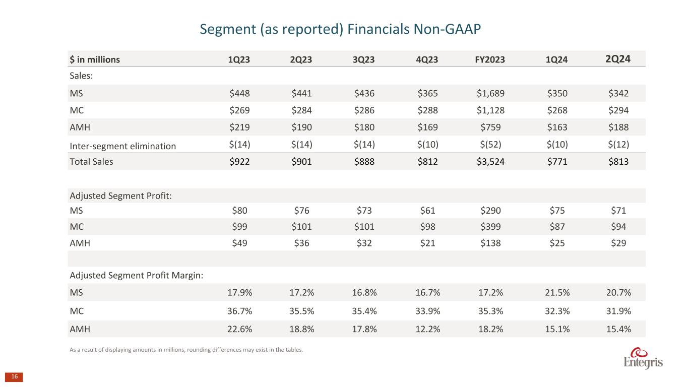 15 $ in millions 1Q23 2Q23 3Q23 4Q23 FY2023 1Q24 2Q24 Adjusted Net Sales $778 $766 $756 $765 $3,066 $737 $813 Adjusted Gross Margin % 48.3% 45.6% 44.0% 43.4% 45.3% 46.1% 46.2% Non-GAAP Operating Expenses $198 $177 $166 $174 $715 $172 $197 Adjusted Operating Income $178 $172 $166 $158 $675 $168 $179 Adjusted Operating Margin 22.9% 22.5% 22.0% 20.6% 22.0% 22.8% 22.0% Adjusted EBITDA $218 $215 $206 $200 $840 $213 $226 Adjusted EBITDA Margin 28.1% 28.1% 27.3% 26.2% 27.4% 28.9% 27.8% Consolidated (excluding divestitures)1 Summary Financials Non-GAAP 1.Excludes the impact of divestitures of the Electronic Chemicals ("EC"), QED, and the Pipeline and Industrial Materials ("PIM") businesses and termination of the alliance agreement with MacDermid Enthone. As a result of displaying amounts in millions, rounding differences may exist in the tables. Excluding Divestitures