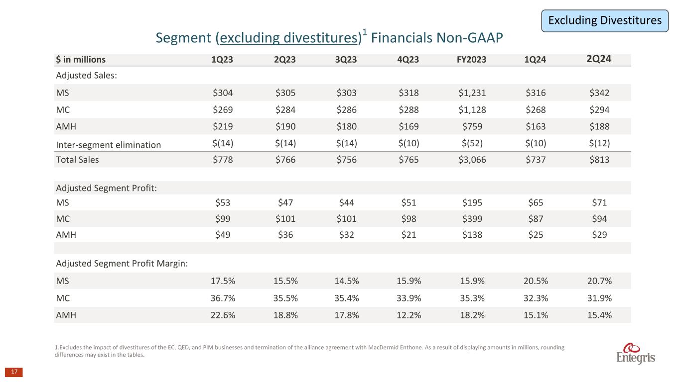 16 Segment (as reported) Financials Non-GAAP $ in millions 1Q23 2Q23 3Q23 4Q23 FY2023 1Q24 2Q24 Sales: MS $448 $441 $436 $365 $1,689 $350 $342 MC $269 $284 $286 $288 $1,128 $268 $294 AMH $219 $190 $180 $169 $759 $163 $188 Inter-segment elimination $(14) $(14) $(14) $(10) $(52) $(10) $(12) Total Sales $922 $901 $888 $812 $3,524 $771 $813 Adjusted Segment Profit: MS $80 $76 $73 $61 $290 $75 $71 MC $99 $101 $101 $98 $399 $87 $94 AMH $49 $36 $32 $21 $138 $25 $29 Adjusted Segment Profit Margin: MS 17.9% 17.2% 16.8% 16.7% 17.2% 21.5% 20.7% MC 36.7% 35.5% 35.4% 33.9% 35.3% 32.3% 31.9% AMH 22.6% 18.8% 17.8% 12.2% 18.2% 15.1% 15.4% As a result of displaying amounts in millions, rounding differences may exist in the tables.
