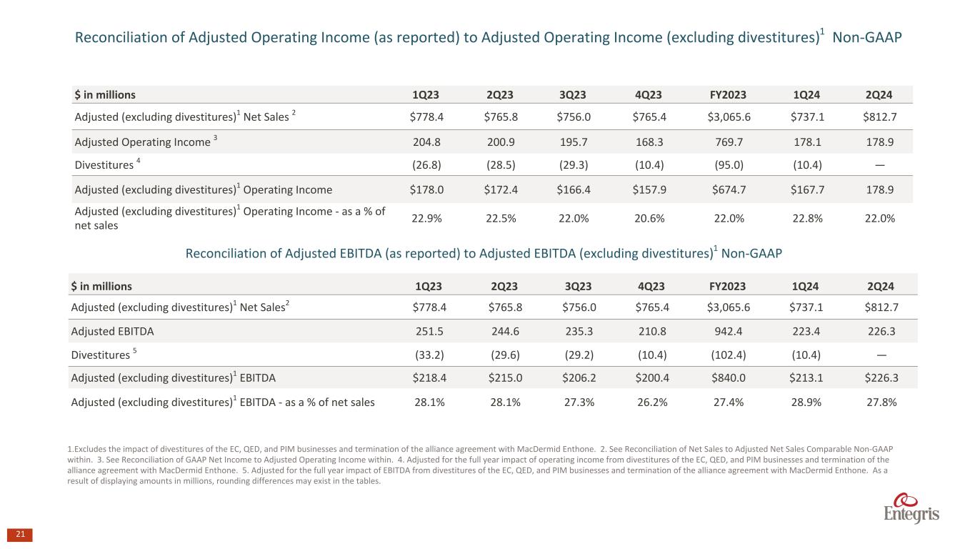 20 Reconciliation of GAAP Net Income to Adjusted Operating Income and Adjusted EBITDA $ in millions 1Q23 2Q23 3Q23 4Q23 FY2023 1Q24 2Q24 Net sales $922.4 $901.0 $888.2 $812.3 $3,523.9 $771.0 $812.7 Net (loss) Income ($88.2) $197.6 $33.2 $38.0 $180.7 $45.3 $67.7 Net (loss) income - as a % of net sales (9.6%) 21.9% 3.7% 4.7% 5.1% 5.9% 8.3% Adjustments to net (loss) income: Income tax expense (benefit) 21.5 (16.5) (2.1) (11.3) (8.4) 3.5 6.7 Interest expense, net 84.8 78.6 75.6 62.1 301.1 54.4 52.5 Other (income) expense, net (4.7) 7.7 10.2 12.1 25.4 14.3 3.0 Equity in net loss of affiliates — 0.1 0.1 0.1 0.4 0.2 0.2 GAAP - Operating income $13.5 $267.6 $117.1 $101.0 $499.2 $117.6 $130.1 Operating margin - as a % of net sales 1.5 % 29.7 % 13.2 % 12.4 % 14.2 % 15.3 % 16.0 % Goodwill impairment 1 88.9 — 15.9 10.4 115.2 — — Deal and transaction costs 2 3.0 — — — 3.0 — — Integration costs: Professional fees 3 12.0 13.3 6.8 4.6 36.7 2.1 0.1 Severance costs 4 1.4 1.0 (0.5) (0.4) 1.5 0.1 0.6 Retention costs 5 1.3 0.4 — — 1.7 — — Other costs 6 2.3 3.8 4.0 3.6 13.7 — — Restructuring costs 7 11.2 — 1.2 2.4 14.8 — — Loss (gain) from sale of businesses and held-for-sale assets, net 8 13.6 14.9 — (4.7) 23.8 (4.8) 0.5 Impairment of long-lived assets 9 — — — 30.5 30.5 13.0 — Amortization of intangible assets 10 57.6 54.7 51.2 51.0 214.5 50.2 47.5 Gain on termination of alliance agreement 11 — (154.8) — (30.0) (184.8) — — Adjusted operating income $204.8 $200.9 $195.7 $168.3 $769.7 $178.1 $178.9 Adjusted operating margin - as a % of net sales 22.2 % 22.3 % 22.0 % 20.7 % 21.8 % 23.1 % 22.0 % Depreciation 46.8 43.7 39.6 42.6 172.7 45.3 47.4 Adjusted EBITDA $251.5 $244.6 $235.3 $210.8 $942.4 $223.4 $226.3 Adjusted EBITDA - as a % of net sales 27.3 % 27.2 % 26.5 % 26.0 % 26.7 % 29.0 % 27.8 % 1.Non-cash impairment charges associated with goodwill. 2.Non-recurring deal and transaction costs associated with the CMC Materials acquisition and completed divestitures. 3.Represents professional and vendor fees recorded in connection with services provided by consultants, accountants, lawyers and other third-party service providers to assist us in integrating CMC Materials into our operations. 4. Represent severance charges related to the integration of the CMC Materials acquisition. 5.Represents retention charges related directly to the CMC Materials acquisition and completed divestitures, and are not part of our normal, recurring cash operating expenses. 6. Represents other employee related costs and other costs incurred relating to the CMC Materials acquisition and completed divestitures. These costs arise outside of the ordinary course of our continuing operations. 7. Restructuring charges resulting from cost-saving initiatives 8.Non- recurring net loss (gain) from the sale of certain businesses and held-for-sale assets. 9. Impairment of long-lived assets. 10.Non-cash amortization expense associated with intangibles acquired in acquisitions. 11.Gain on termination of the alliance agreement with MacDermid Enthone. As a result of displaying amounts in millions, rounding differences may exist in the tables.