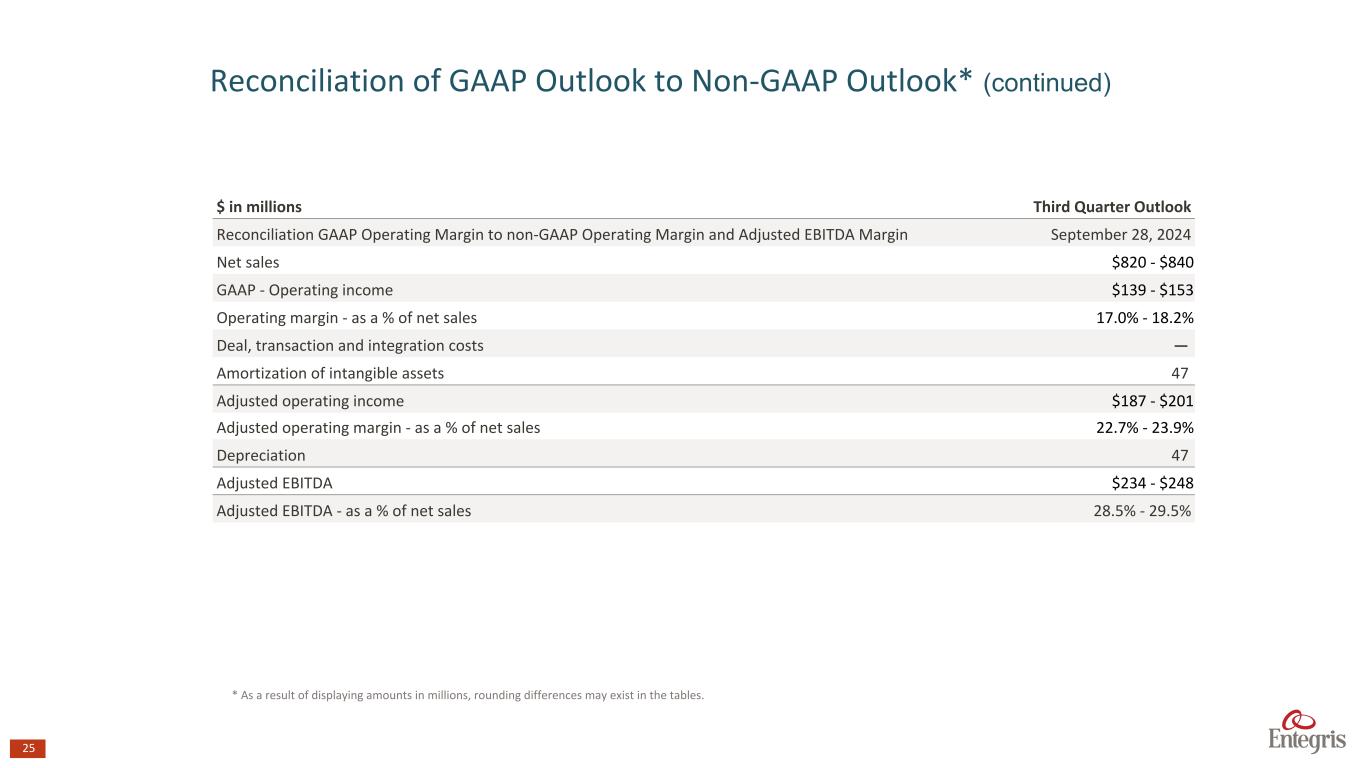 24 $ in millions Third Quarter Outlook Reconciliation GAAP net income to non-GAAP net income: September 28, 2024 GAAP net income $78 - $85 Adjustments to net income: Deal, transaction and integration costs — Amortization of intangible assets 47 Income tax effect (11) Non-GAAP net income $114 - $121 Third Quarter Outlook Reconciliation GAAP diluted earnings per share to non-GAAP diluted earnings per share: September 28, 2024 Diluted earnings per common share $0.51 - $0.56 Adjustments to diluted earnings per common share: Deal, transaction and integration costs — Amortization of intangible assets 0.31 Income tax effect (0.07) Diluted non-GAAP earnings per common share $0.75 - $0.80 $ in millions Third Quarter Outlook Reconciliation GAAP operating expenses to non-GAAP operating expenses: September 28, 2024 GAAP operating expenses $238 - $242 Adjustments to net income: Deal, transaction and integration costs $ — Amortization of intangible assets 47 Non-GAAP operating expenses $191 - $195 Reconciliation of GAAP Outlook to Non-GAAP Outlook* * As a result of displaying amounts in millions, rounding differences may exist in the tables.