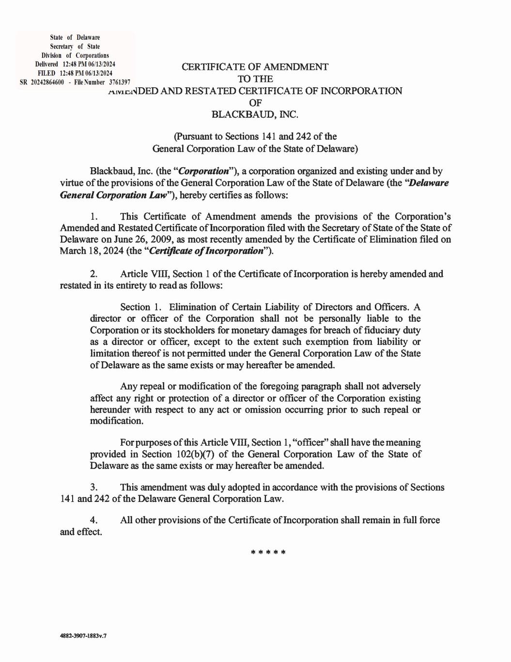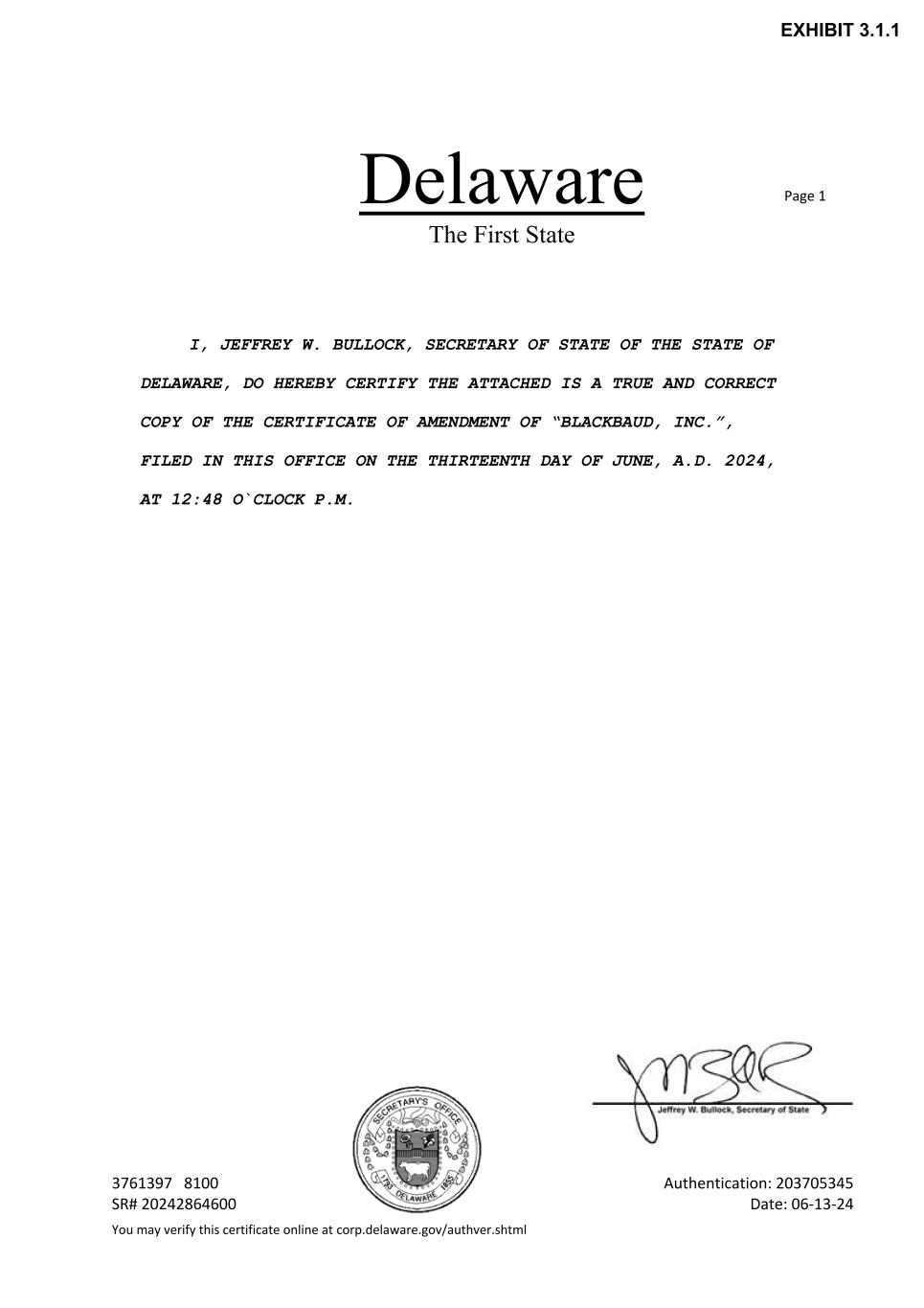 Delaware The First State Page 1 3761397 8100 Authentication: 203705345 SR# 20242864600 Date: 06-13-24 You may verify this certificate online at corp.delaware.gov/authver.shtml I, JEFFREY W. BULLOCK, SECRETARY OF STATE OF THE STATE OF DELAWARE, DO HEREBY CERTIFY THE ATTACHED IS A TRUE AND CORRECT COPY OF THE CERTIFICATE OF AMENDMENT OF “BLACKBAUD, INC.”, FILED IN THIS OFFICE ON THE THIRTEENTH DAY OF JUNE, A.D. 2024, AT 12:48 O`CLOCK P.M. EXHIBIT 3.1.1