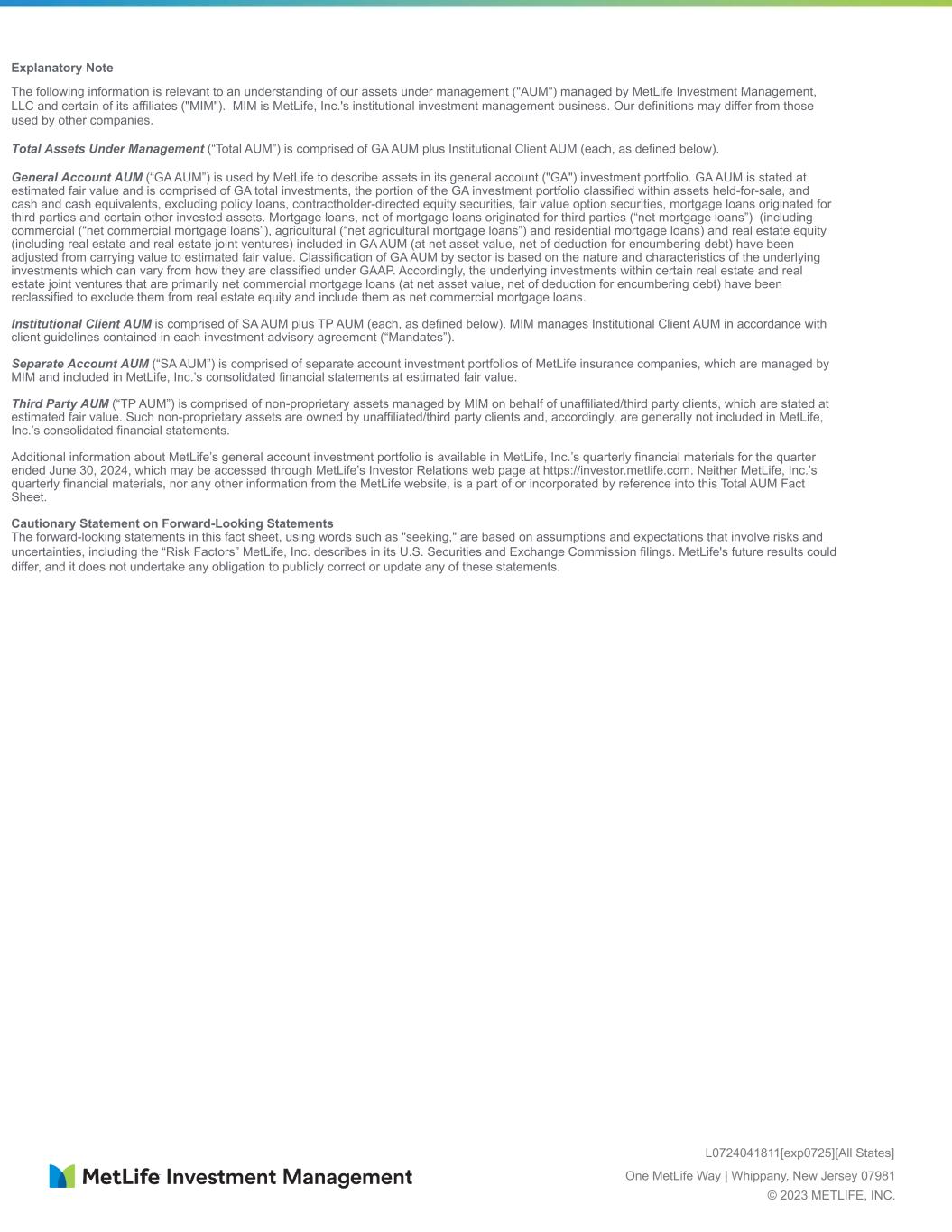 | • | Total MetLife, Inc.’s common stockholders’ equity, excluding total notable items (excludes AOCI other than FCTA): total MetLife, Inc.’s common stockholders’ equity, excluding the net unrealized investment gains (losses), future policy benefits discount rate remeasurement gains (losses), market risk benefits instrument-specific credit risk remeasurement gains (losses), defined benefit plans adjustment components of AOCI, and total notable items, net of income tax. | |||||||||||||
