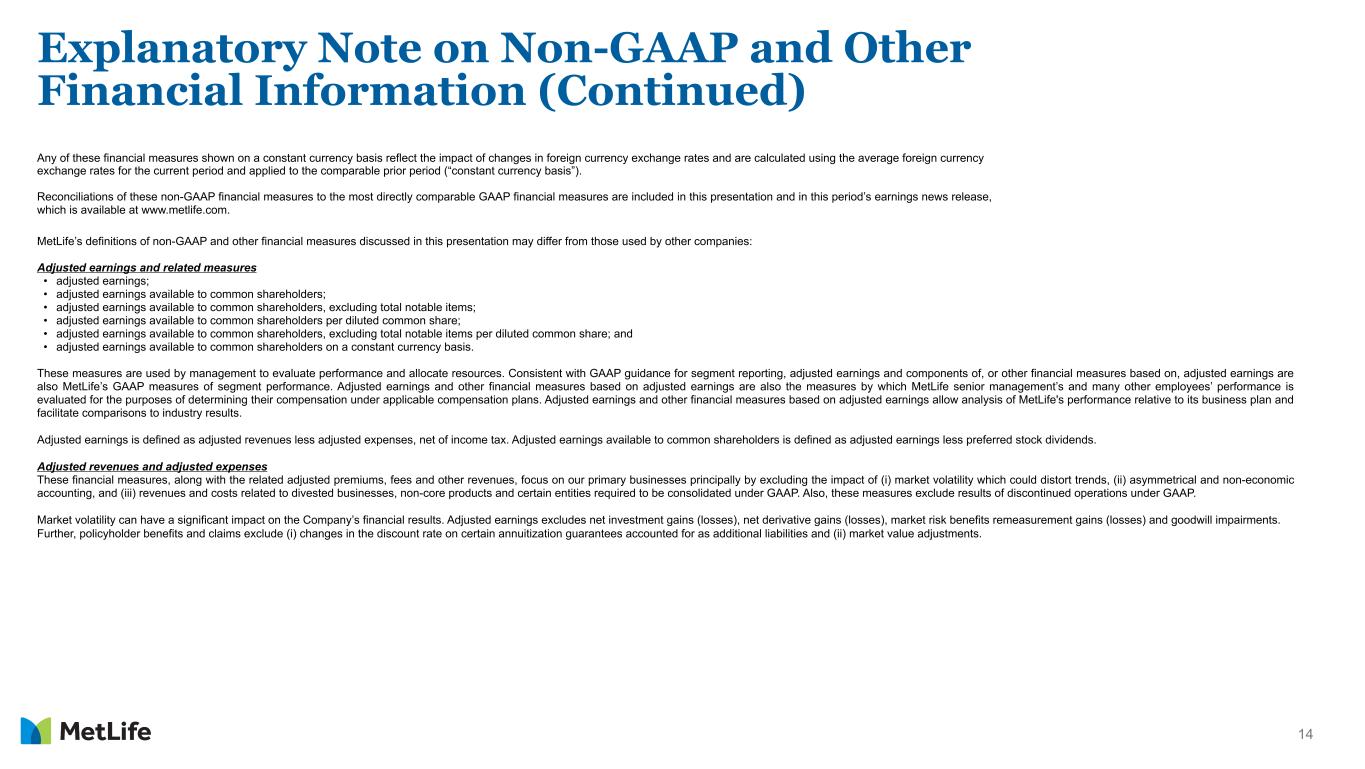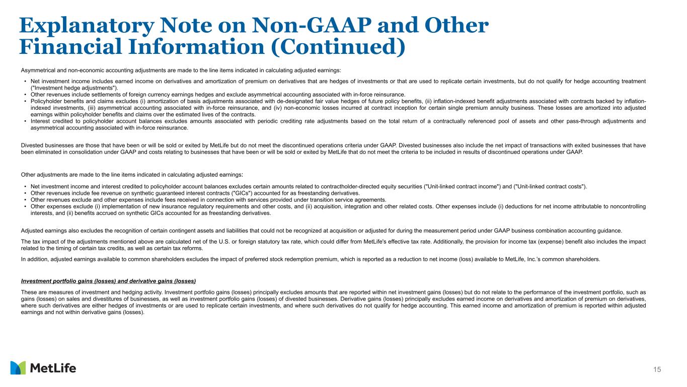 | These financial measures, along with the related adjusted premiums, fees and other revenues, focus on our primary businesses principally by excluding the impact of (i) market volatility which could distort trends, (ii) asymmetrical and non-economic accounting, and (iii) revenues and costs related to divested businesses, non-core products and certain entities required to be consolidated under GAAP. Also, these measures exclude results of discontinued operations under GAAP. Market volatility can have a significant impact on MetLife’s financial results. Adjusted earnings excludes net investment gains (losses), net derivative gains (losses), market risk benefits remeasurement gains (losses) and goodwill impairments. Further, policyholder benefits and claims exclude (i) changes in the discount rate on certain annuitization guarantees accounted for as additional liabilities and (ii) market value adjustments. | ||||||||||||||
