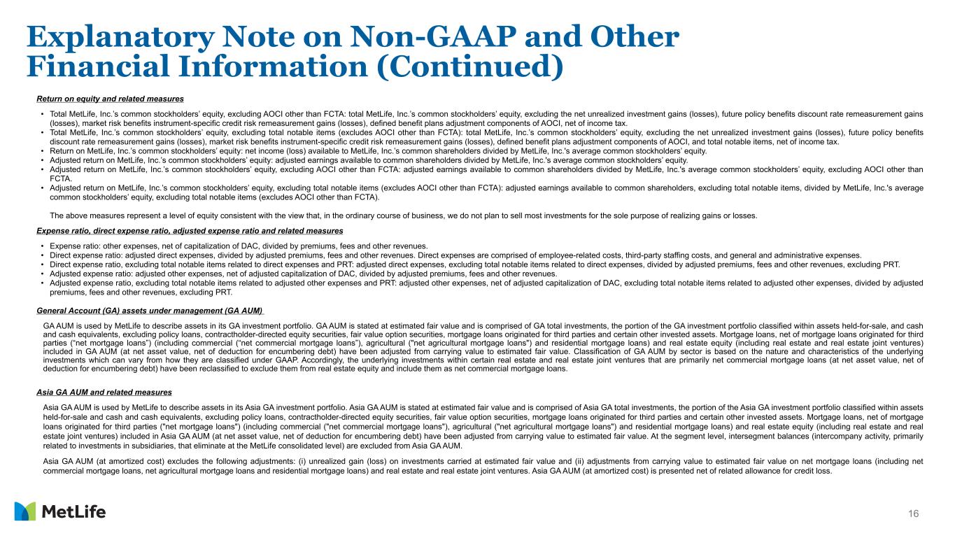 | • | Adjusted return on MetLife, Inc.’s common stockholders’ equity, excluding total notable items (excludes AOCI other than FCTA): adjusted earnings available to common shareholders, excluding total notable items, divided by MetLife, Inc.'s average common stockholders’ equity, excluding total notable items (excludes AOCI other than FCTA). | |||||||||||||