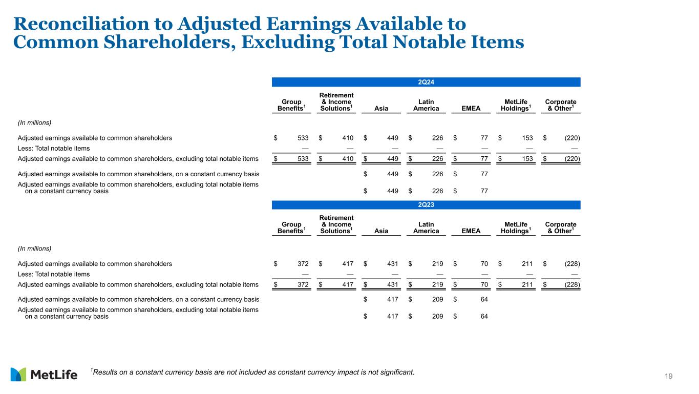| (viii) | adjusted earnings available to common shareholders, excluding total notable items; | (viii) | net income (loss) available to MetLife, Inc.’s common shareholders; | |||||||||||